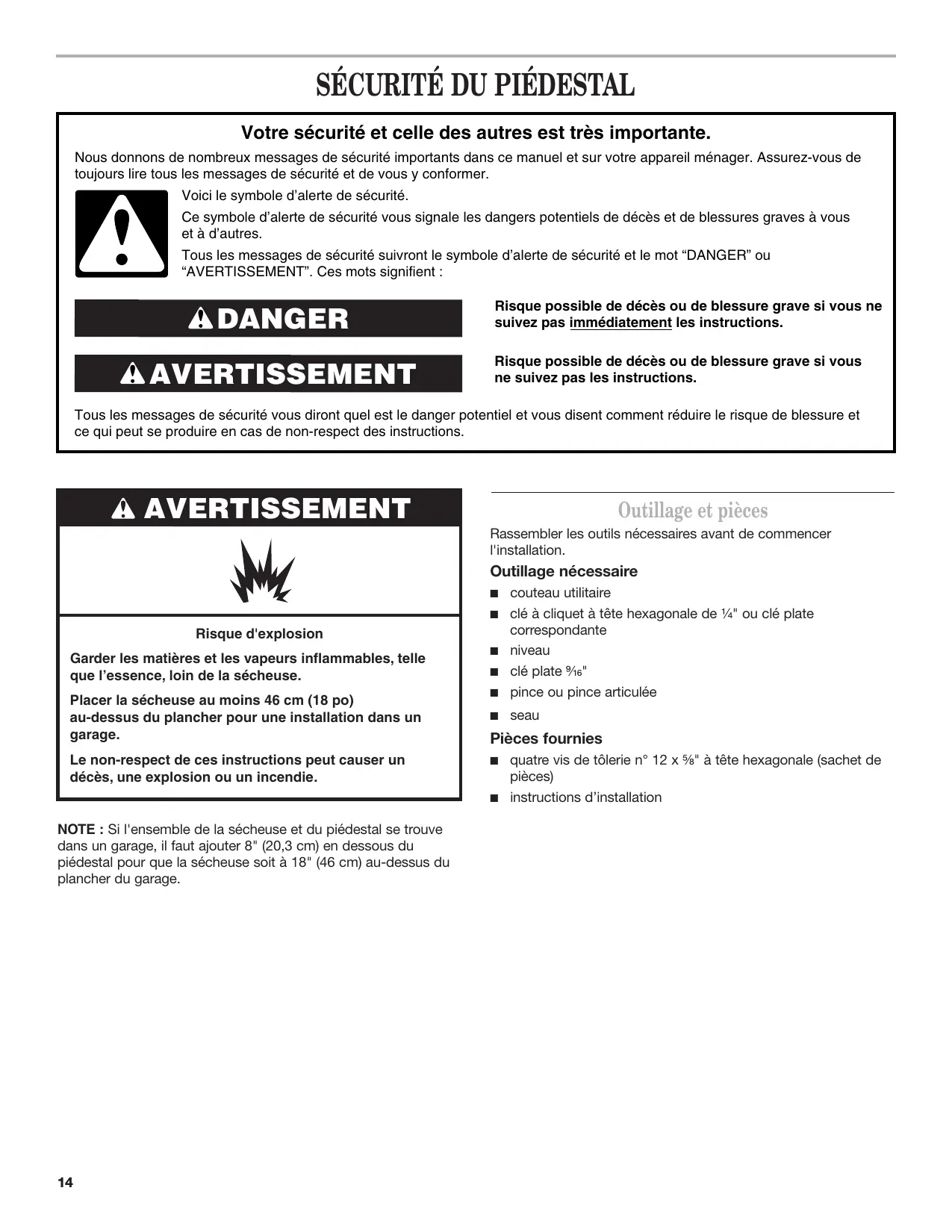 NOTE : Si l'ensemble de la sécheuse et du piédestal se trouve dans un garage, il faut ajouter 8" (20,3 cm) en dessous du piédestal pour que la sécheuse soit à 18" (46 cm) au-dessus du plancher du garage.