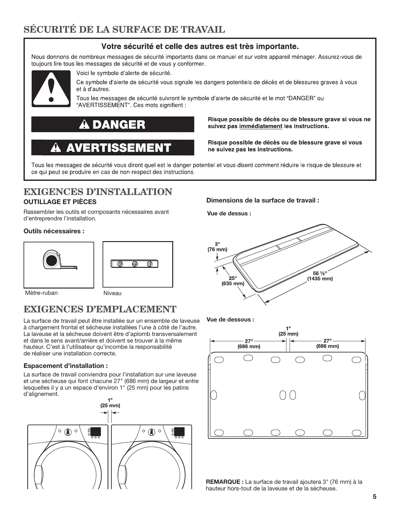 La surface de travail conviendra pour l'installation sur une laveuse et une sécheuse qui font chacune 27'' (686 mm) de largeur et entre lesquelles il y a un espace d'environ 1" (25 mm) pour les patins d'alignement.