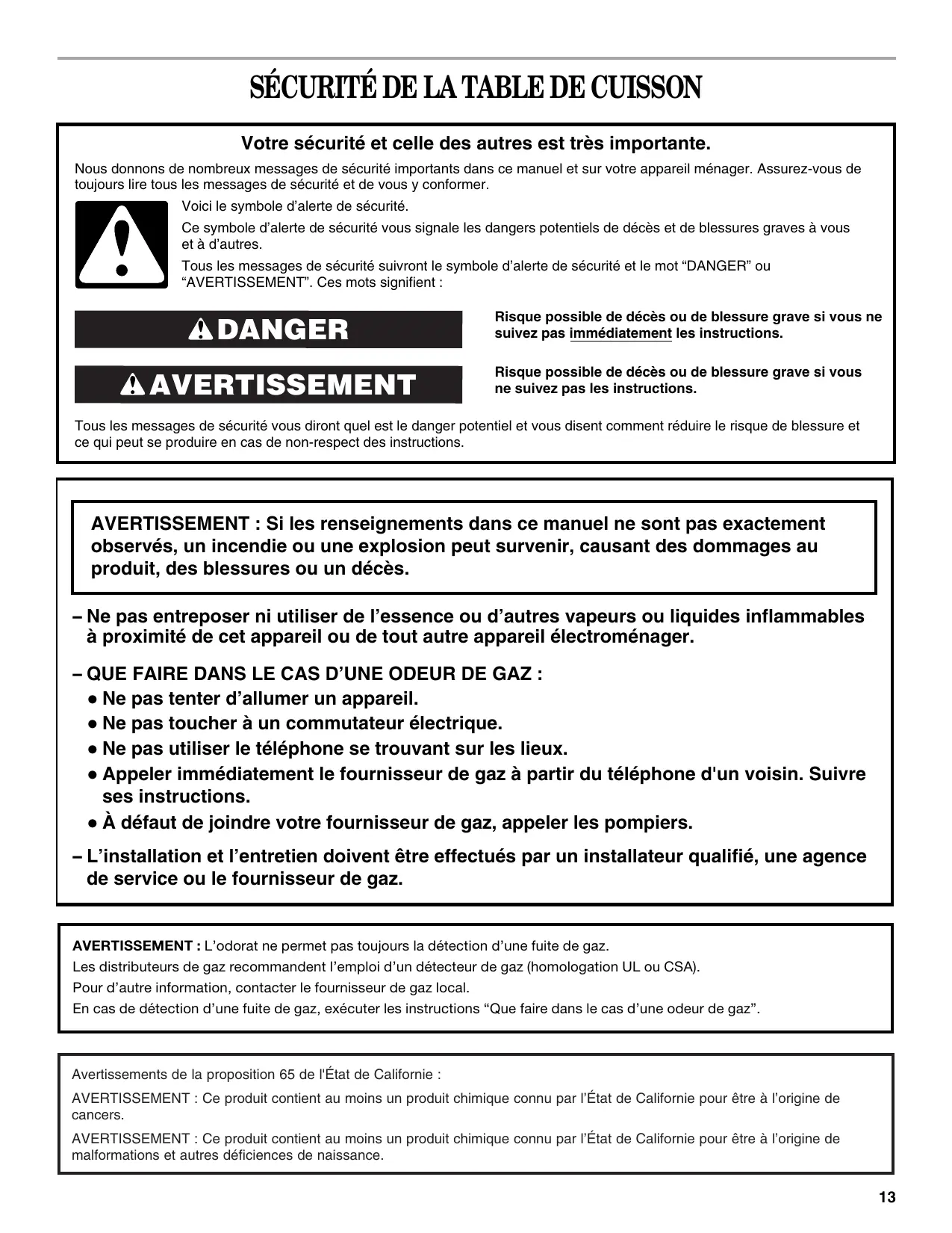 AVERTISSEMENT : L'odorat ne permet pas toujours la détéction d'une fuite de gaz.