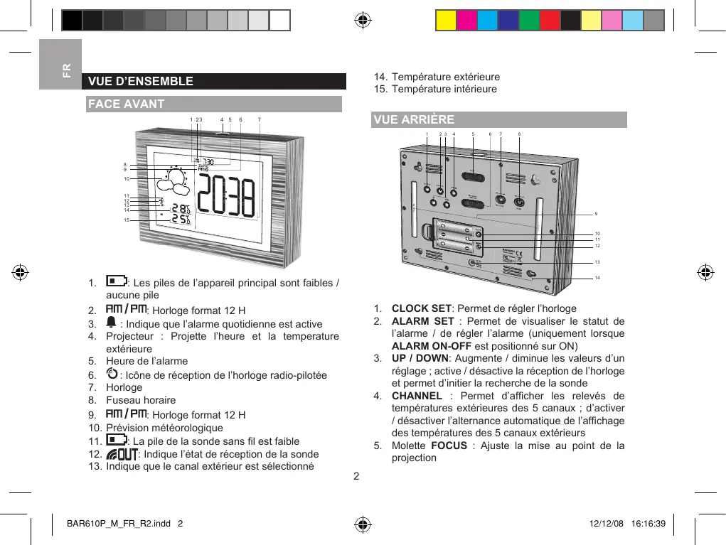 : Les piles de l’appareil principal sont faibles / aucune pile : Horloge format 12 H : Indique que l’alarme quotidienne est active Projecteur : Projette l’heure et la temperature extérieure Heure de l’alarme : Icône de réception de l’horloge radio-pilotée Horloge Fuseau horaire : Horloge format 12 H Prévision météorologique : La pile de la sonde sans fil est faible : Indique l’état de réception de la sonde Indique que le canal extérieur est sélectionné BAR610P_M_FR_R2.indd 2