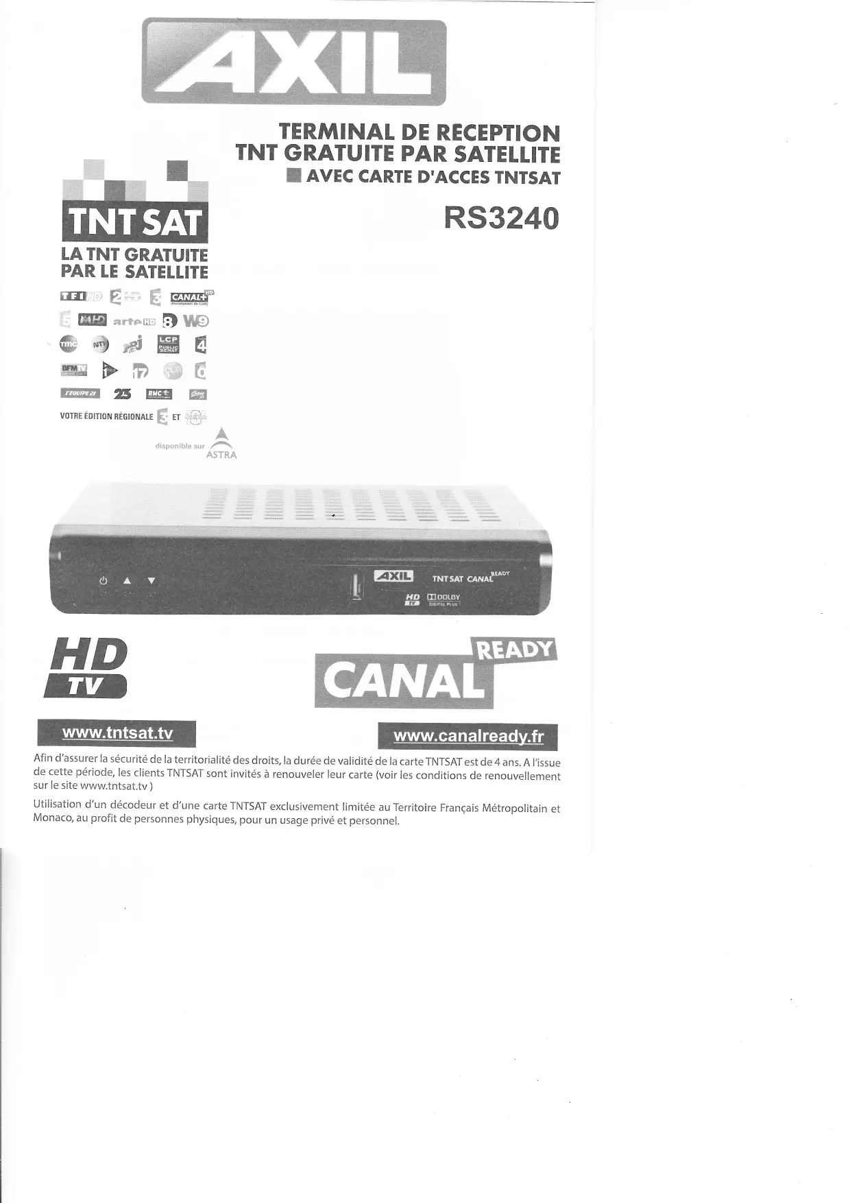 RS3240 - Décodeur TV satellite AXIL - Notice d'utilisation et mode d'emploi gratuit