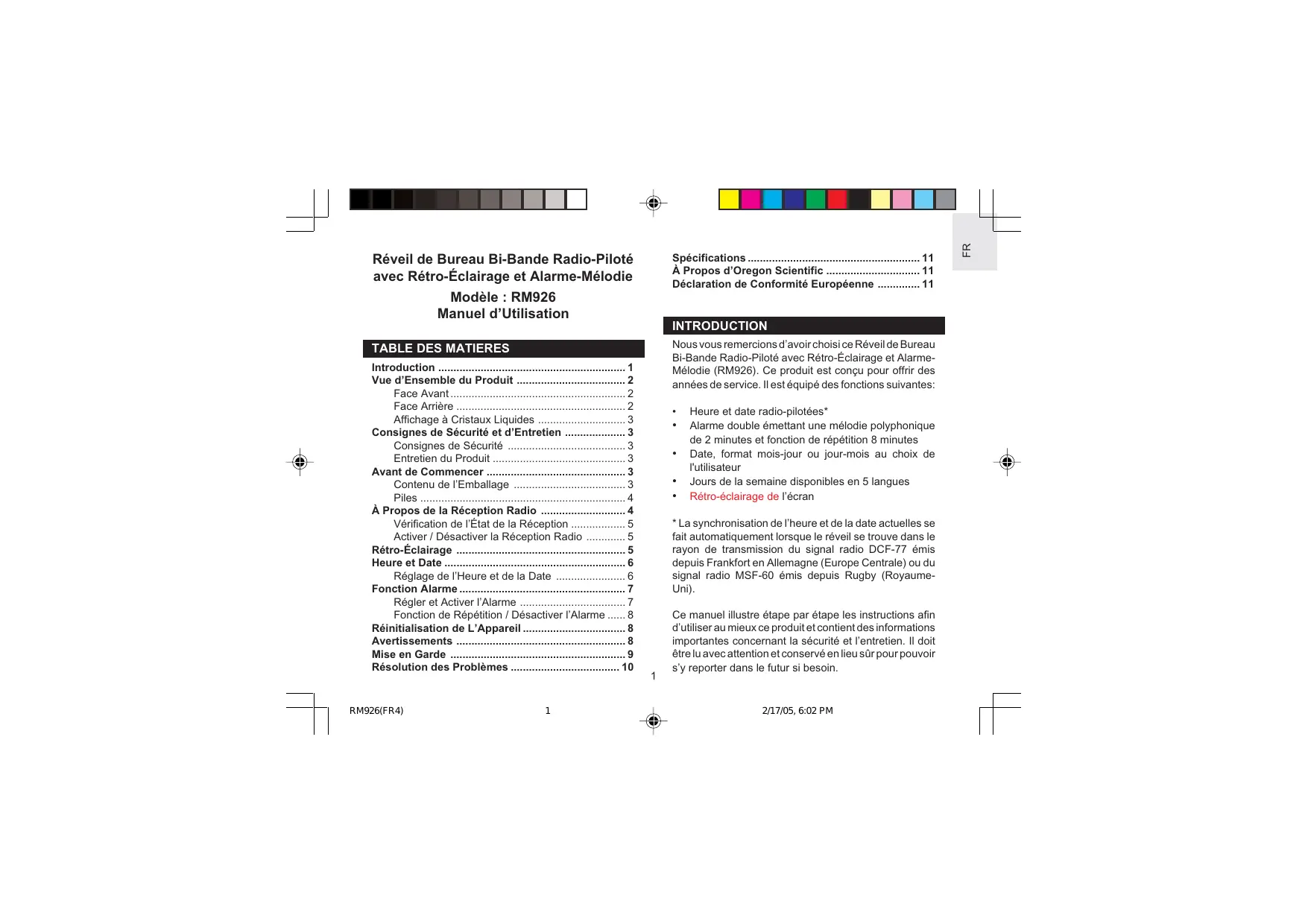 RM926 - Réveil OREGON - Notice d'utilisation et mode d'emploi gratuit