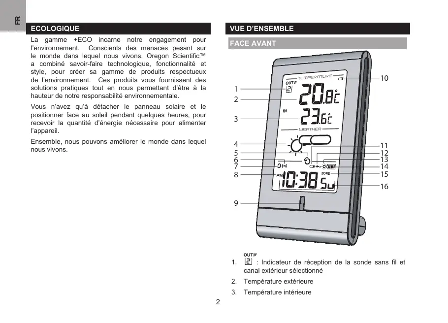 ECOLOGIQUE Vue d’ensemble La gamme +ECO incarne notre engagement pour l’environnement. Conscients des menaces pesant sur le monde dans lequel nous vivons, Oregon Scientific™ a combiné savoir-faire technologique, fonctionnalité et style, pour créer sa gamme de produits respectueux de l’environnement. Ces produits vous fournissent des solutions pratiques tout en nous permettant d’être à la hauteur de notre responsabilité environnementale. Face Avant