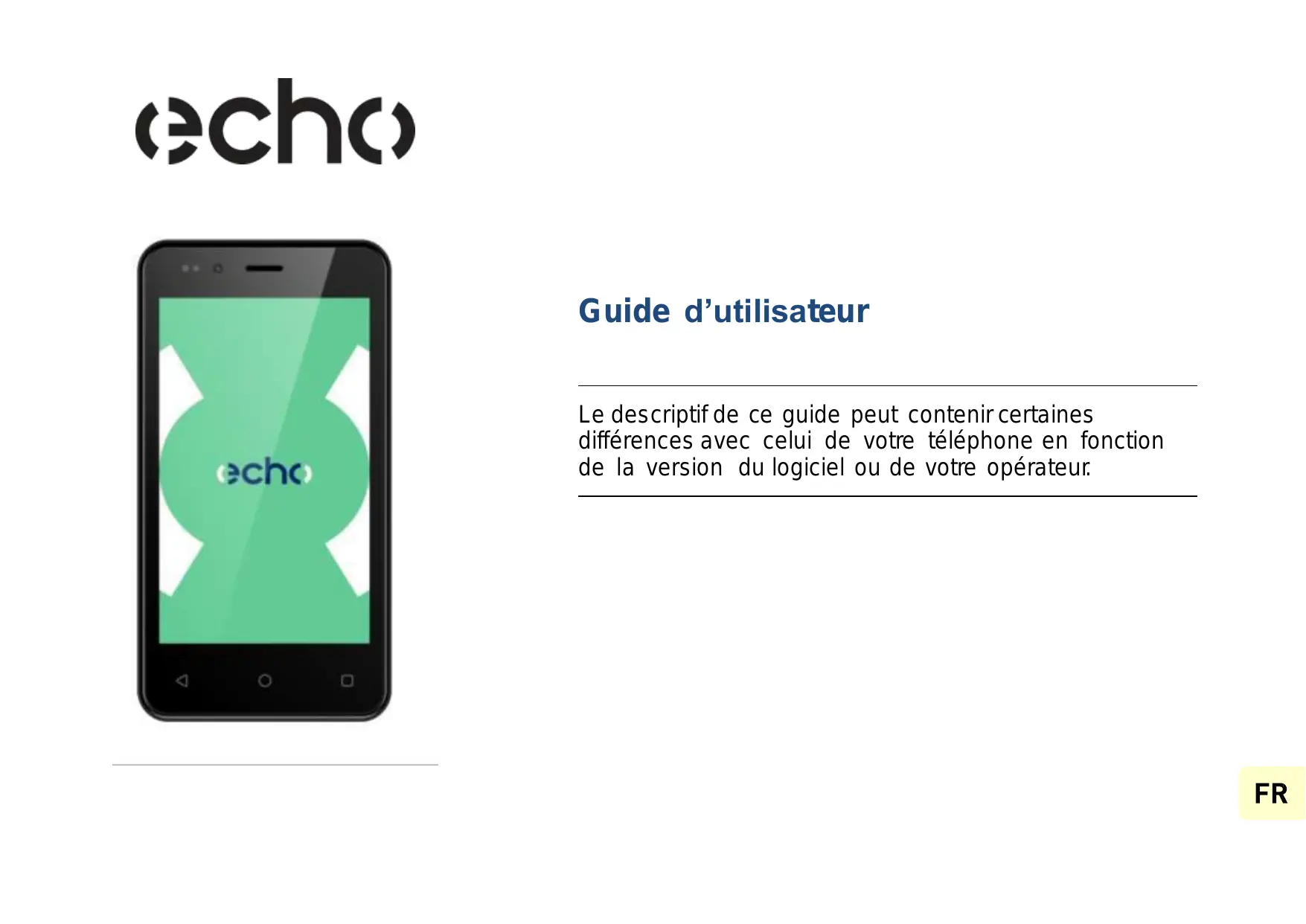 Smart Mini User guide Guide d’utilisateur Manuale d’uso Guide d’utilisateur Le descriptif de ce guide peut contenir certaines différences avec celui de votre téléphone en fonction de la version du logiciel ou de votre opérateur. FÉLICITATIONS ! Vous venez d’acquérir votre mobile ECHO SMART MINI. Vous trouverez dans ce guide toutes les informations relatives à l’utilisation de ce téléphone portable afin, nous le souhaitons, de vous familiariser rapidement avec l’univers ECHO. Copyright ©2015 ECHO www.echomobiles.com Les informations contenues dans ce manuel ne peuvent être en aucun cas transmises ou reproduites sous quelque forme que ce soit et sans l’autorisation écrite de ECHO. Marques commerciales ECHO est une marque déposée de Modelabs Mobiles SAS. Avis Ce manuel a été réalisé avec la plus grande attention et a pour but de vous guider dans l’utilisation de cet appareil. Les informations et recommandations qui y figurent ne constituent cependant pas une garantie au sens des articles L211-4 et suivants du Code de la Consommation. ECHO se réserve le droit de modifier à tout moment les informations contenues dans ce manuel. Limite de responsabilité L’intégralité des services et contenus accessibles depuis cet appareil sont la propriété exclusive de tiers et sont donc protégés par des lois (Droit d’auteur, brevet, licence, et autres lois sur la propriété intellectuelle). Ces services sont réservés à votre usage personnel et non pour une utilisation commerciale. Il est impossible d’utiliser ces contenus ou services sans demande écrite au propriétaire du contenu. Vous ne pouvez en aucune manière copier, publier, transférer, vendre ou exploiter sur quelque support que ce soit, des contenus ou des services édités par le biais de cet appareil ou d’en produire des formes dérivées.