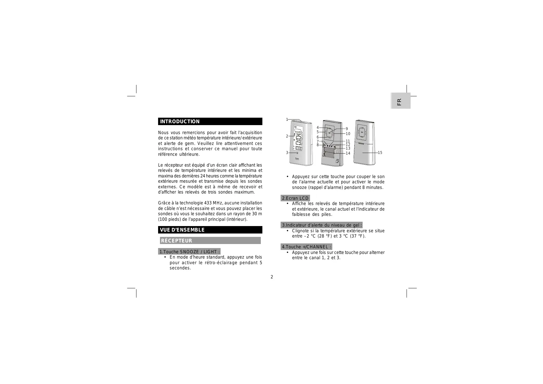 INTRODUCTION Nous vous remercions pour avoir fait l’acquisition de ce station météo température intérieure/ extérieure et alerte de gem. Veuillez lire attentivement ces instructions et conserver ce manuel pour toute référence ultérieure.