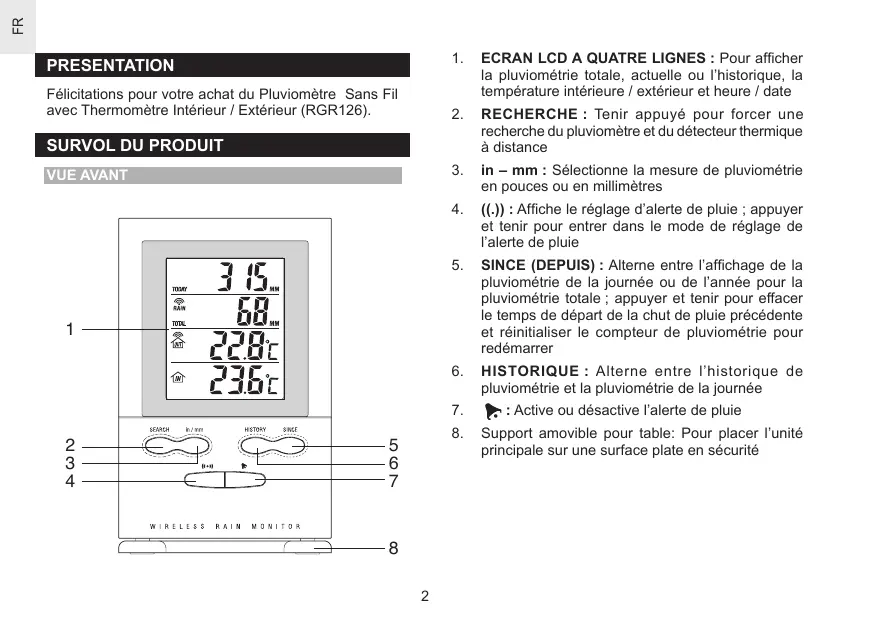 PRESENTATION Félicitations pour votre achat du Pluviomètre Sans Fil avec Thermomètre Intérieur / Extérieur (RGR126).