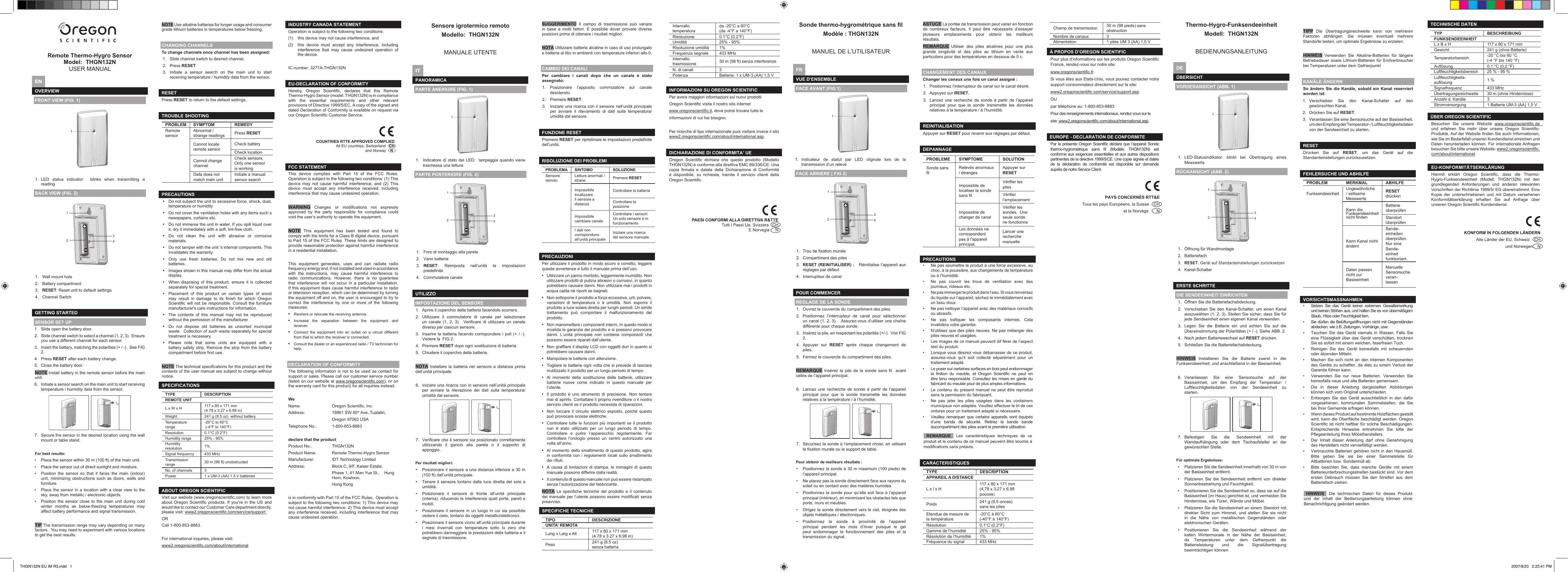 gewünschten Kanal. par téléphone au: 1-800-853-8883 Pour des renseignements internationaux, rendez vous sur le Ne pas soumettre le produit à une force excessive, au choc, à la poussière, aux changements de température ou à l’humidité. Ne pas couvrir les trous de ventilation avec des journaux, rideaux etc. Ne pas immerger le produit dans l’eau. Si vous renversez du liquide sur l’appareil, séchez-le immédiatement avec un tissu doux. Ne pas nettoyer l’appareil avec des matériaux corrosifs ou abrasifs. Ne pas trafiquer les composants internes. Cela invalidera votre garantie. N’utilisez que des piles neuves. Ne pas mélanger des piles neuves et usagées. Les images de ce manuel peuvent dif férer de l’aspect réel du produit. Lorsque vous désirez vous débarrasser de ce produit, assurez-vous qu’il soit collecté séparément pour un traitement adapté. Le poser sur certaines surfaces en bois peut endommager la finition du meuble, et Oregon Scientific ne peut en être tenu responsable. Consultez les mises en garde du fabricant du meuble pour de plus amples informations. Le contenu du présent manuel ne peut être reproduit sans la permission du fabriquant. Ne pas jeter les piles usagées dans les containers municipaux non adaptés. Veuillez effectuer le tri de ces ordures pour un traitement adapté si nécessaire. Veuillez remarquer que certains appareils sont équipés d’une bande de sécurité. Retirez la bande bande ducompartiment des piles avant la première utilisation. REMARQUE Les caractéristiques techniques de ce produit et le contenu de ce manuel peuvent être soumis à modifications sans préavis. LxlxH Poids 241 g (8,5 onces) sans les piles Etendue de mesure de la température -20°C à 60°C (-40°F à 140°F) Résolution Gamme de l’humidité Résolution de l’humidité Fréquence du signal 0,1°C (0,2°F) 25% - 95% 433 MHz den