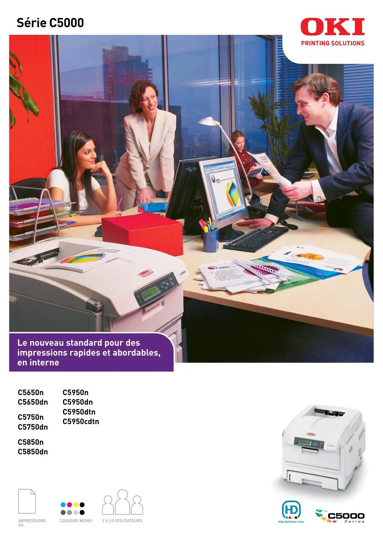 Parce que tous les groupes de travail ont des besoin différents en matière d'impression, la série C5000 répond à toutes les exigences. Les modèles C5650 et C5750 sont destinés aux groupes de travail souhaitant imprimer de gros volumes en monochrome et à faible coût mais qui ont besoin d'utiliser occasionnellement la couleur. En revanche, les modèles C5850 et C5950 sont plus spécialement conçus pour les groupes de travail imprimant la plupart du temps en couleur. Plusieurs options sont en outre disponibles dont les bacs supplémentaires, le module recto verso et la fonctionnalité avancée de sécurité des documents.