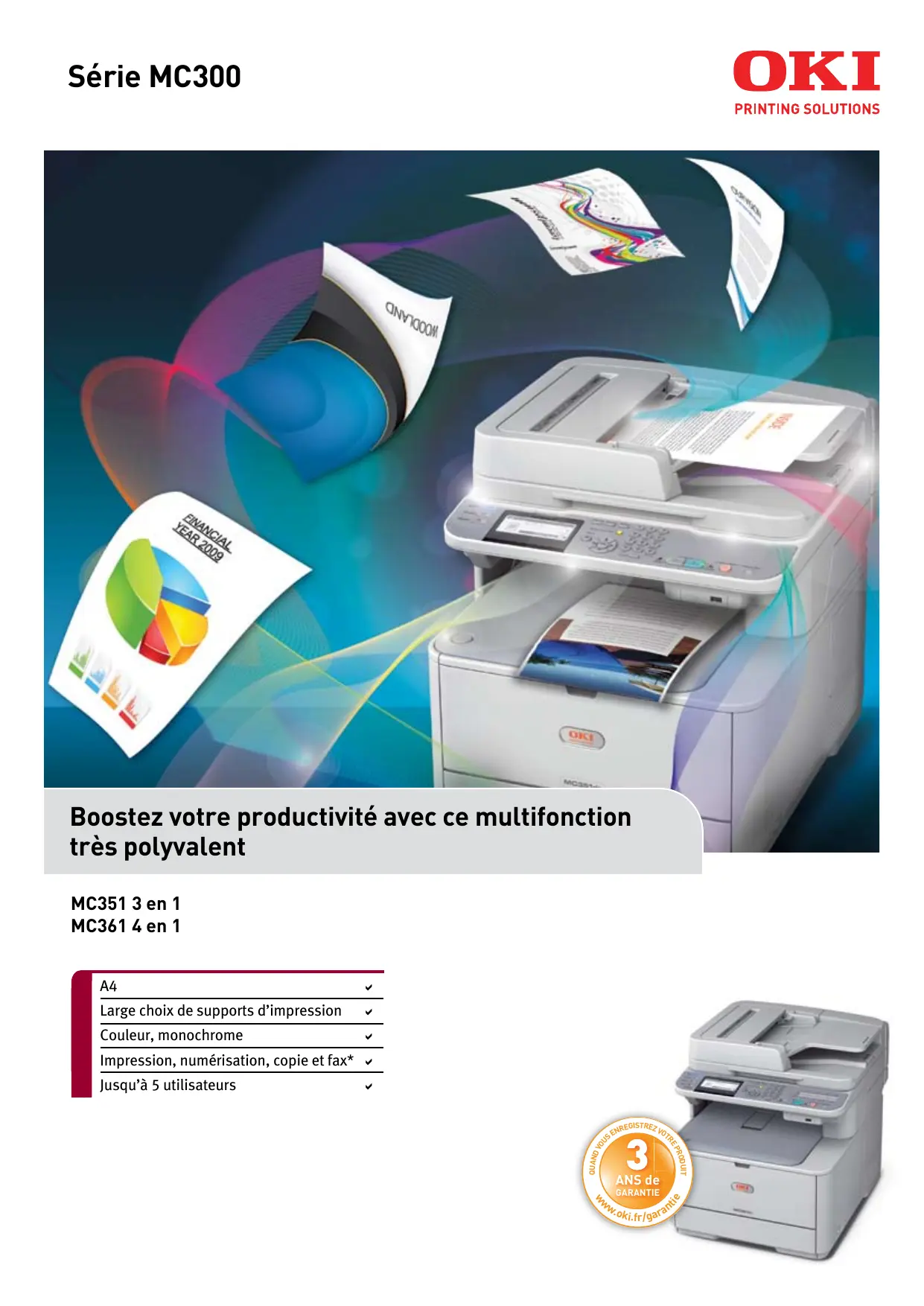 La série MC300 est dotée de la technologie d'impression numérique LED OKI qui garantit des impressions fiables et de haute qualité depuis plus de 20 ans. C'est pourquoi nous pouvons offrir une garantie sur site de trois ans. Avec peu de pièces en mouvement et la technologie monopasse OKI, la série MC300 est infatigable, jour après jour.