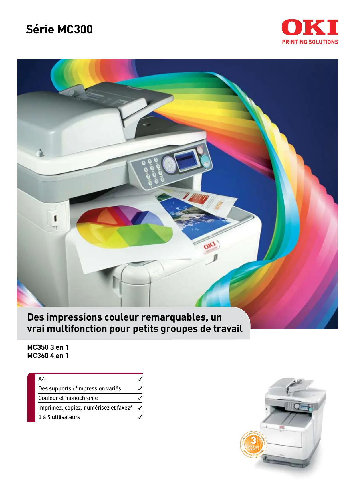 - Nuance OmniPage convertit les documents en fichiers électroniques modifiables. MC350 MC360 Imprimez, copiez, numérisez Imprimez, copiez, numérisez et faxez Les caractéristiques de la gamme MC300 d’un seul coup d’œil Vitesse d’impression (A4) 12 ppm couleur/ 16 ppm monochrome (MC350) 16 ppm couleur/ 20 ppm monochrome (MC360) Vitesse de télécopie* ITU-T G3 (Super G3) 33,6 kbps, 3 secondes/page Temps de sortie de la première page 15 secondes couleur/ 12 secondes monochrome (MC350) 12 secondes couleur/ 10 secondes monochrome (MC360) Mémoire fax* 4 Mo (environ 200 pages) Capacité papier 251 feuilles de 80 g/m² ProQ2400, 1200 x 600 dpi Grammage Qualité d’impression Jusqu’à 203 g/m² Langage Langage propriétaire OKI (GDI/RASTER) Dimensions (HxLxP) 521 x 447 x 547 mm Chargement des documents à numériser Chargeur automatique de 50 feuilles (ADF), scanner à plat Mémoire