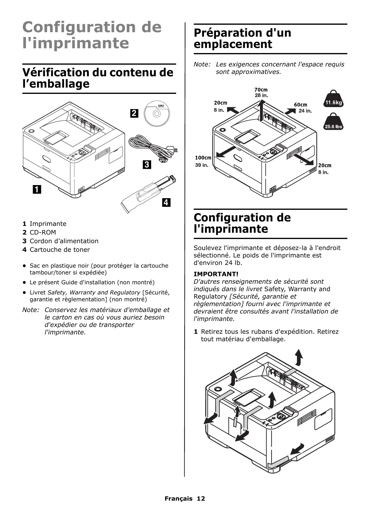 Note: Les exigences concernant l'espace requis sont approximatives. Configuration de l'imprimante Imprimante CD-ROM Cordon d’alimentation Cartouche de toner