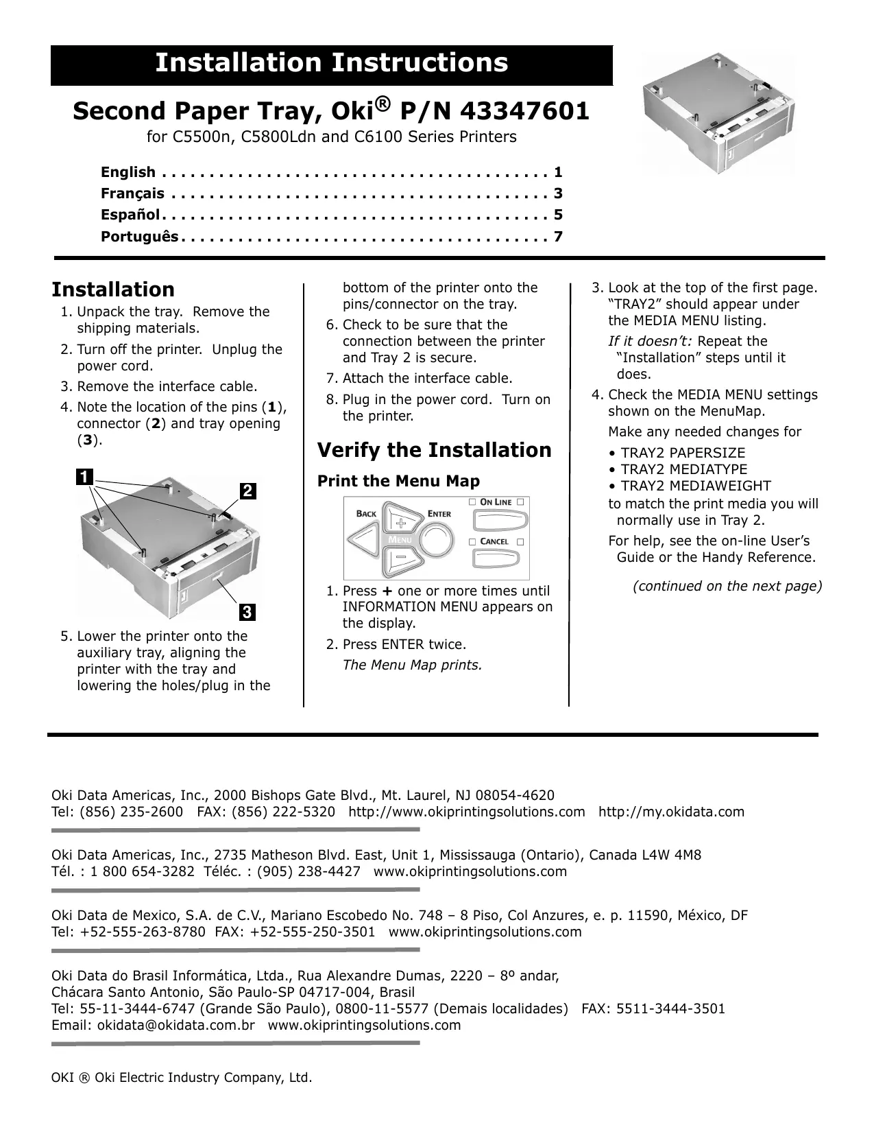 (Appliquer les changements). Quittez pour accéder au bureau. Français Instrucciones de Instalación Segunda Bandeja de Papel, Oki® P/N 43347601 para impresoras C5500n, C5800Ldn, y Serie C6100 Instalación