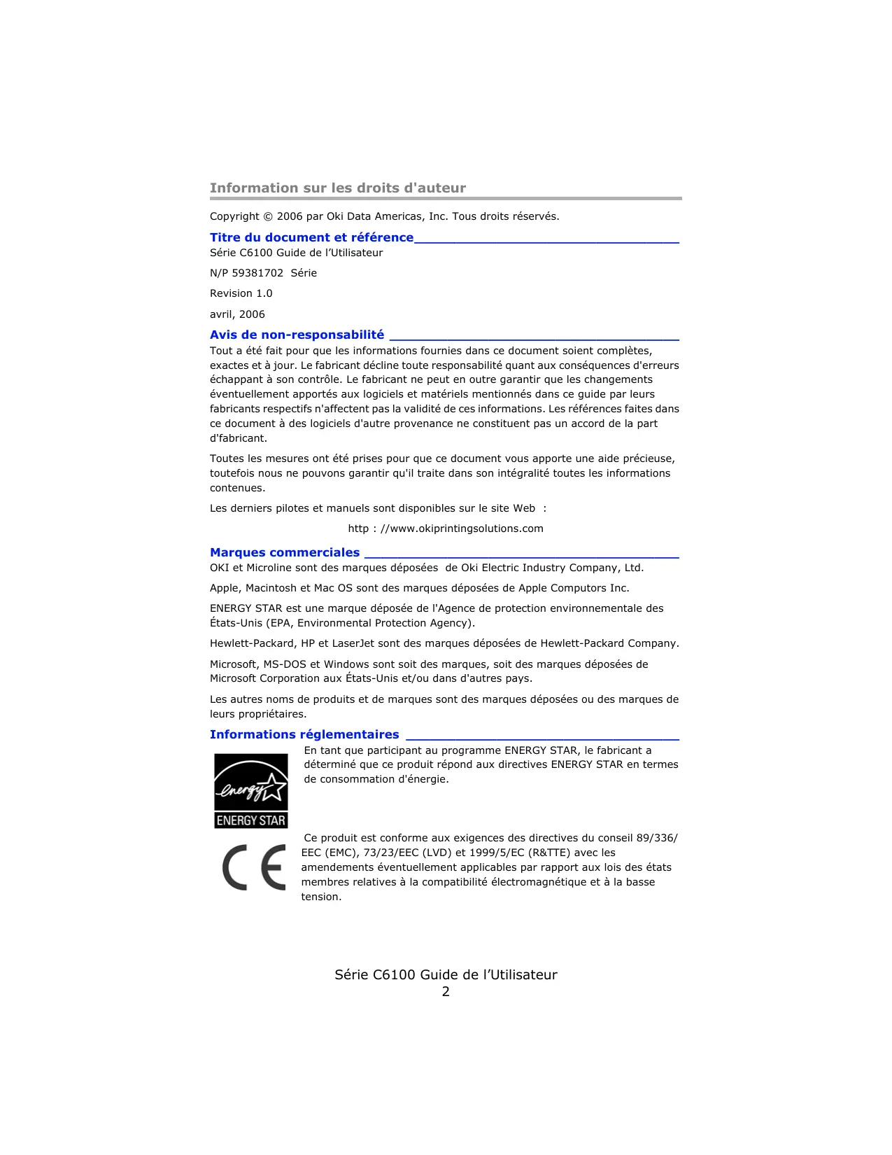 Information sur les droits d'auteur Copyright © 2006 par Oki Data Americas, Inc. Tous droits réservés. Titre du document et référence. Série C6100 Guide de l'Utilisateur N/P 59381702 Série Revision 1.0 avril, 2006 Avis de non-responsabilité Tout a été fait pour que les informations fournies dans ce document soient complètes, exactes et à jour. Le fabricant décline toute responsabilité quant aux conséquences d'erreurs échappant à son contrôle. Le fabricant ne peut en outre garantir que les changements éventuellement apportés aux logiciels et matériels mentionnés dans ce guide par leurs fabricants respectifs n'affectent pas la validité de ces informations. Les références faites dans ce document à des logiciels d'autre provenance ne constituent pas un accord de la part d'fabricant. Toutes les mesures ont été prises pour que ce document vous apporte une aide précieuse, toutefois nous ne pouvons garantir qu'il traite dans son intégralité toutes les informations contenues. Les derniers pilotes et manuels sont disponibles sur le site Web: http : //www.okiprintingsolutions.com Marques commerciales OKI et Microline sont des marques déposées de Oki Electric Industry Company, Ltd. Apple, Macintosh et Mac OS sont des marques déposées de Apple Computors Inc. ENERGY STAR est une marque déposée de l'Agence de protection environnementale des États-Unis (EPA, Environmental Protection Agency). Hewlett-Packard, HP et LaserJet sont des marques déposées de Hewlett-Packard Company. Microsoft, MS-DOS et Windows sont soit des marques, soit des marques déposées de Microsoft Corporation aux États-Unis et/ou dans d'autres pays. Les autres noms de produits et de marques sont des marques déposées ou des marques de leurs propriétaires. Informations réglementaires En tant que participant au programme ENERGY STAR, le fabricant a déterminé que ce produit répond aux directives ENERGY STAR en termes de consommation d'énergie. ENERGY STAR Ce produit est conforme aux exigences des directives du conseil 89/336/ EEC (EMC), 73/23/EEC (LVD) et 1999/5/EC (R&TTE) avec les amendements éventuellement applicables par rapport aux lois des états membres relatives à la compatibilité électromagnétique et à la basse tension.
