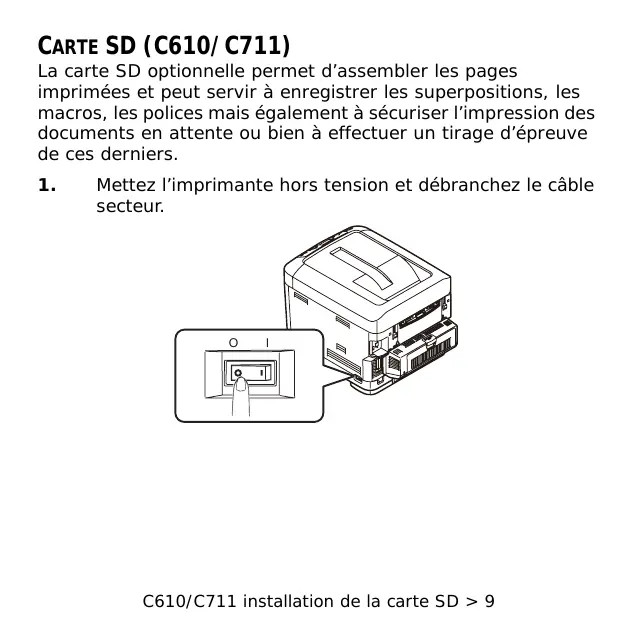 Rebranchez le câble secteur et mettez l’imprimante sous tension. C530 installation de la carte SD > 36