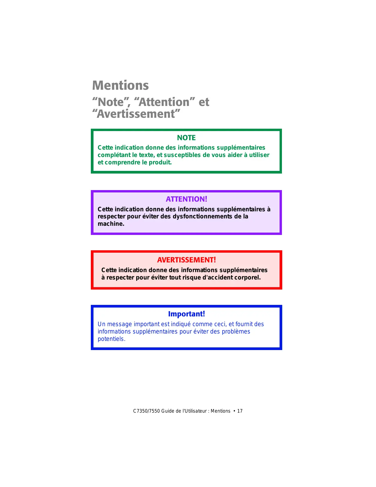 Mentions “Note”, “Attention” et “Avertissement” NOTE Cette indication donne des informations supplémentaires complétant le texte, et susceptibles de vous aider à utiliser et comprendre le produit. ATTENTION! Cette indication donne des informations supplémentaires à respecter pour éviter des dysfonctionnements de la machine. AVERTISSEMENT! Cette indication donne des informations supplémentaires à respecter pour éviter tout risque d'accident corporel. Important! Un message important est indiqué comme ceci, et fournit des informations supplémentaires pour éviter des problèmes potentiels. C7350/7550 Guide de l'Utilisateur : Mentions + 17