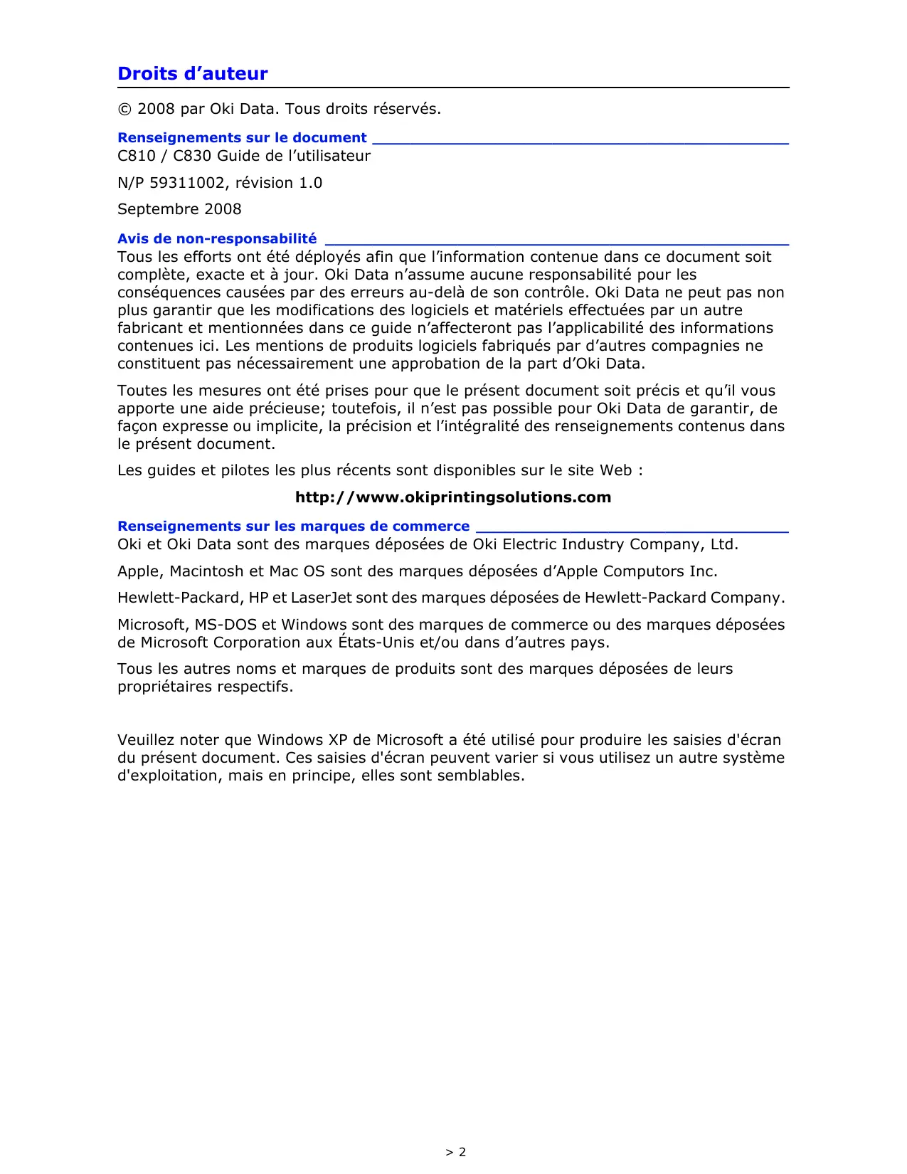 Droits d'auteur © 2008 par Oki Data. Tous droits réservés. Renseignements sur le document C810 / C830 Guide de l'utilisateur N/P 59311002, révision 1.0 Septembre 2008 Avis de non-responsabilité Tous les efforts ont été déployés afin que l'information contenue dans ce document soit complète, exacte et à jour. Oki Data n'assume aucune responsabilité pour les conséquences causées par des erreurs au-delà de son contrôle. Oki Data ne peut pas non plus garantir que les modifications des logiciels et matériels effectuées par un autre fabricant et mentionnées dans ce guide n'affecteront pas l’applicabilité des informations contenues ici. Les mentions de produits logiciels fabriqués par d'autres compagnies ne constituent pas nécessairement une approbation de la part d'Oki Data. Toutes les mesures ont été prises pour que le présent document soit précis et qu'il vous apporte une aide précieuse; toutefois, il n’est pas possible pour Oki Data de garantir, de façon expresse ou implicite, la précision et l'intégralité des renseignements contenus dans le présent document. Les guides et pilotes les plus récents sont disponibles sur le site Web : http://www.okiprintingsolutions.com Renseignements sur les marques de commerce Oki et Oki Data sont des marques déposées de Oki Electric Industry Company, Ltd. Apple, Macintosh et Mac OS sont des marques déposées d'Apple Computors Inc. Hewlett-Packard, HP et LaserJet sont des marques déposées de Hewlett-Packard Company. Microsoft, MS-DOS et Windows sont des marques de commerce ou des marques déposées de Microsoft Corporation aux États-Unis et/ou dans d'autres pays. Tous les autres noms et marques de produits sont des marques déposées de leurs propriétaires respectifs. Veuillez noter que Windows XP de Microsoft a été utilisé pour produire les saisies d'écran du présent document. Ces saisies d'écran peuvent varier si vous utilisez un autre système d'exploitation, mais en principe, elles sont semblables.