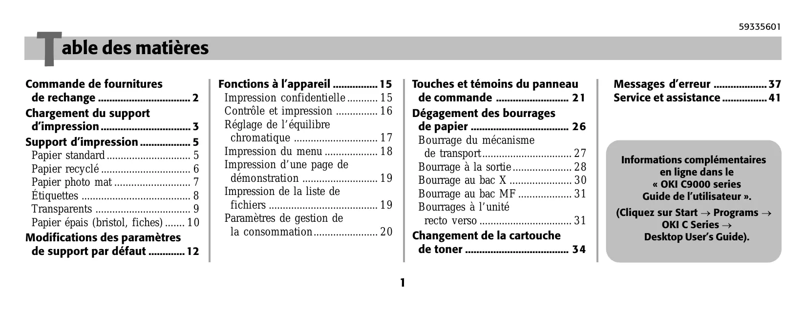 Messages d'erreur Informations complémentaires en ligne dans le « OKI C9000 series Guide de l'utilisateur ». (Cliquez sur Start > Programs —> OKI C Series -> Desktop User's Guide).