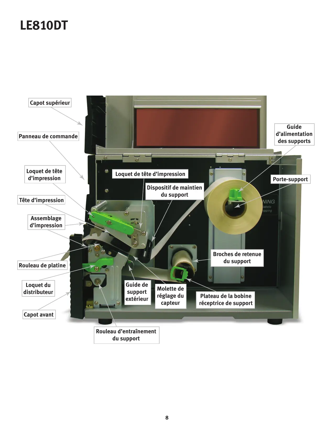 - Ouvrez le capot avant en, enlevant le loquet du distributeur vert et en basculant le capot vers l'avant et vers la gauche. Cela donne accès au mécanisme d'impression sur trois côtés.