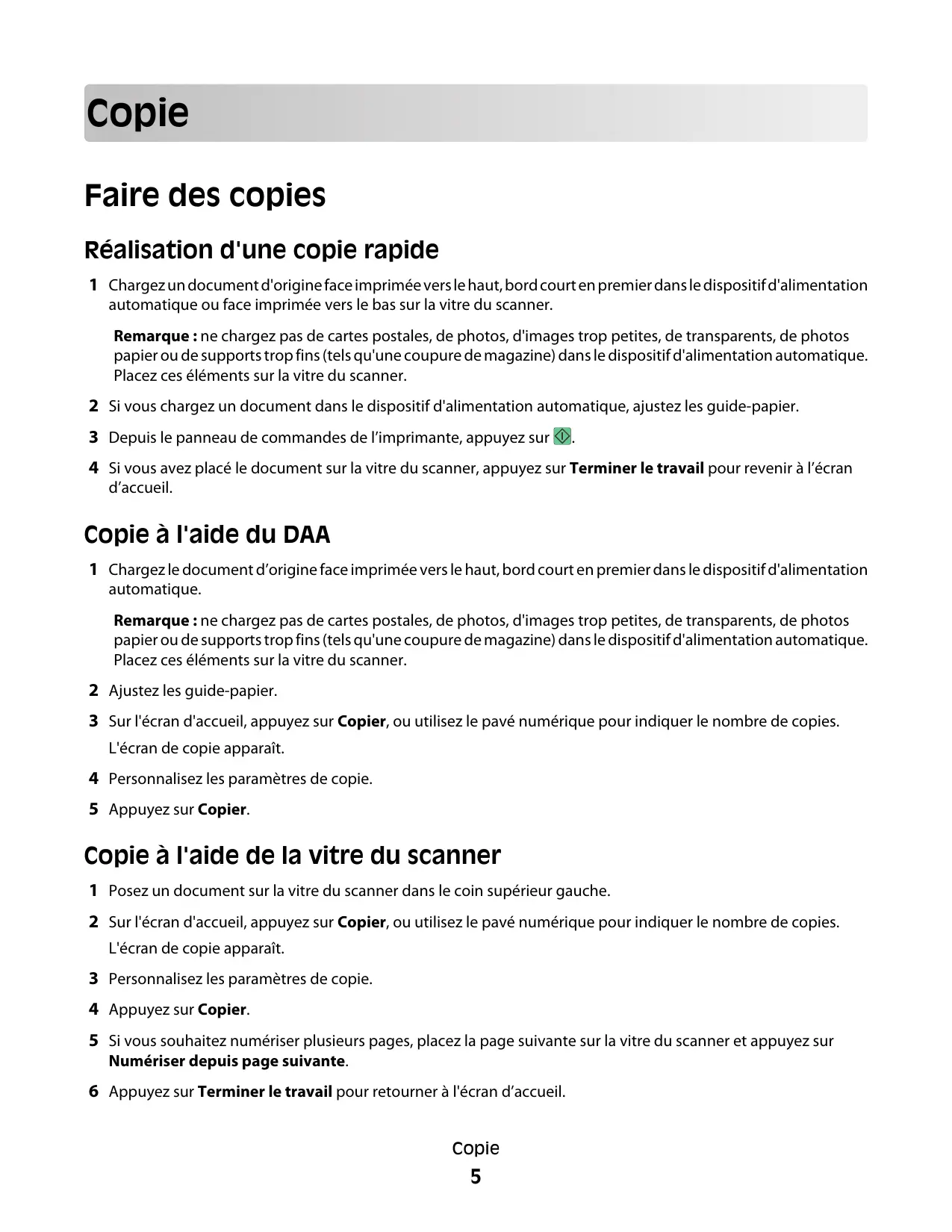 Copie Faire des copies Réalisation d'une copie rapide 1 Chargez un document d'origine face imprimée vers le haut, bord court en premier dans le dispositif d'alimentation automatique ou face imprimée vers le bas sur la vitre du scanner. Remarque : ne chargez pas de cartes postales, de photos, d'images trop petites, de transparents, de photos papier ou de supports trop fins (tels qu'une coupure de magazine) dans le dispositif d'alimentation automatique. Placez ces éléments sur la vitre du scanner. 2 Si vous chargez un document dans le dispositif d'alimentation automatique, ajustez les guide-papier. 3 Depuis le panneau de commandes de l’imprimante, appuyez sur