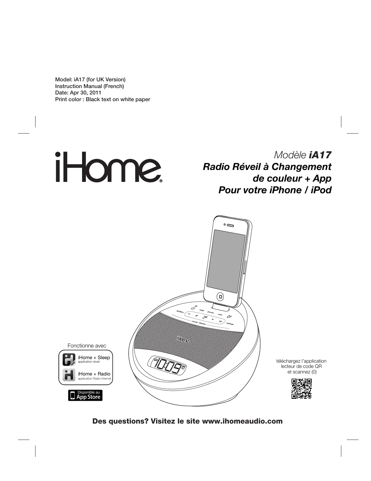 Model: iA17 (for UK Version) Instruction Manual (French) Date: Apr 30, 2011 Print color : Black text on white paper Modèle iA17 Radio Réveil à Changement de couleur + App Pour votre iPhone / iPod Fonctionne avec iHome + Sleep application réveil iHome + Radio téléchargez l’application lecteur de code QR et scannez (0) application Radio Internet Disponible au Des questions? Visitez le site www.ihomeaudio.com Table des matières Contrôles et indicateurs