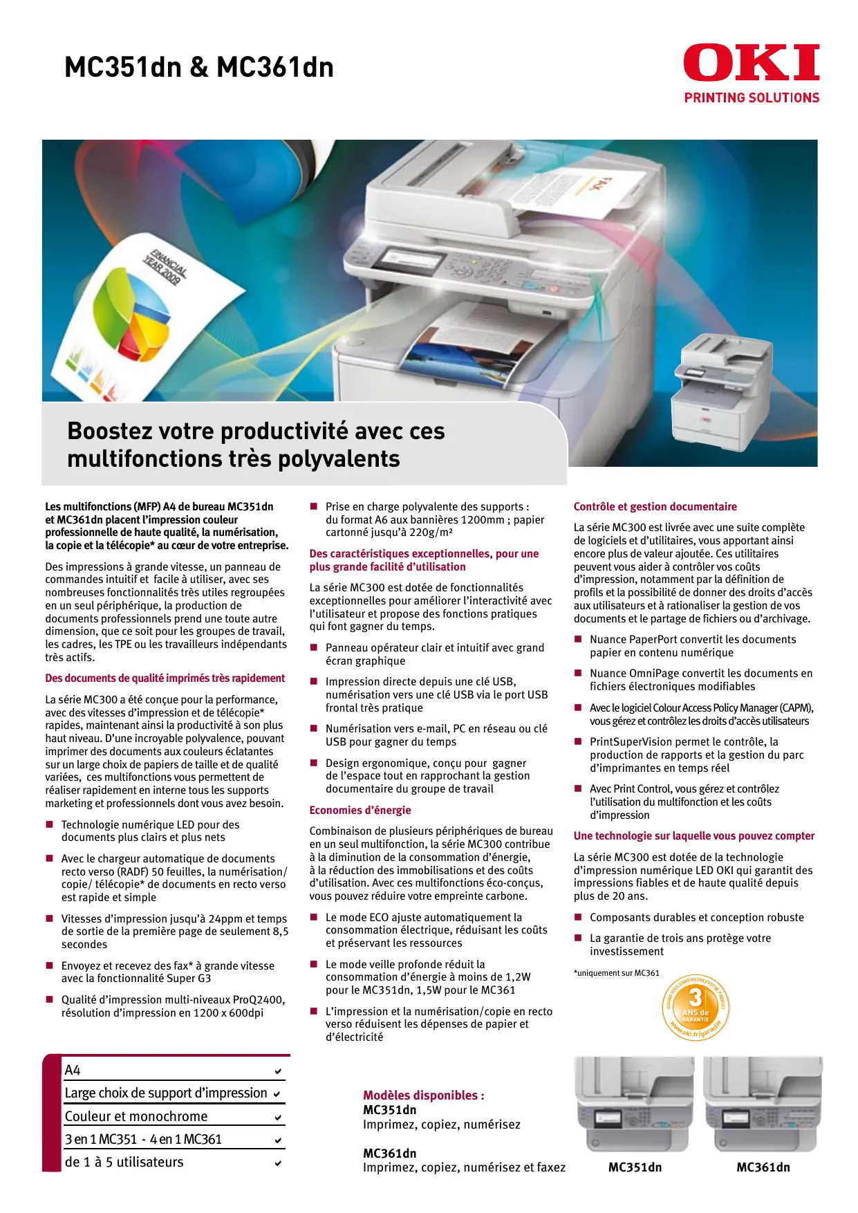 La série MC300 a été consque pour la performance, avec des vitesses d'impression et de télécopie* rapides, maintainant ainsi la productivité à son plus haut niveau. D'une incroyable polyvalence, pouvant imprimer des documents aux couleurs éclatantes sur un large choix de papiers de taille et de qualité variees, ces multifonctions vous permettent de réaliser rapidement en interne tous les supports marketing et professionnels dont vous avez besoin.