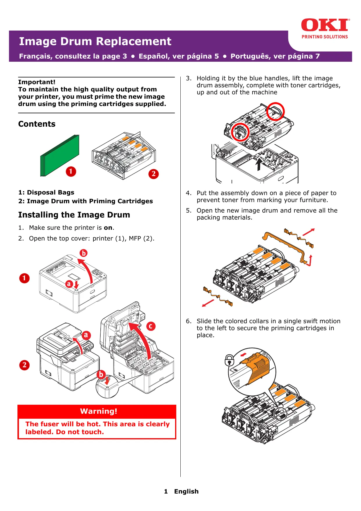 l’assemblage de tambour d’impression avec les cartouches de toner hors de l'appareil. Important! Afin de maintenir la grande qualité d’impression de votre imprimante, vous devez amorcer le nouveau tambour d’impression à l’aide des cartouches d’amorçage fournies. Contenu de l’emballage