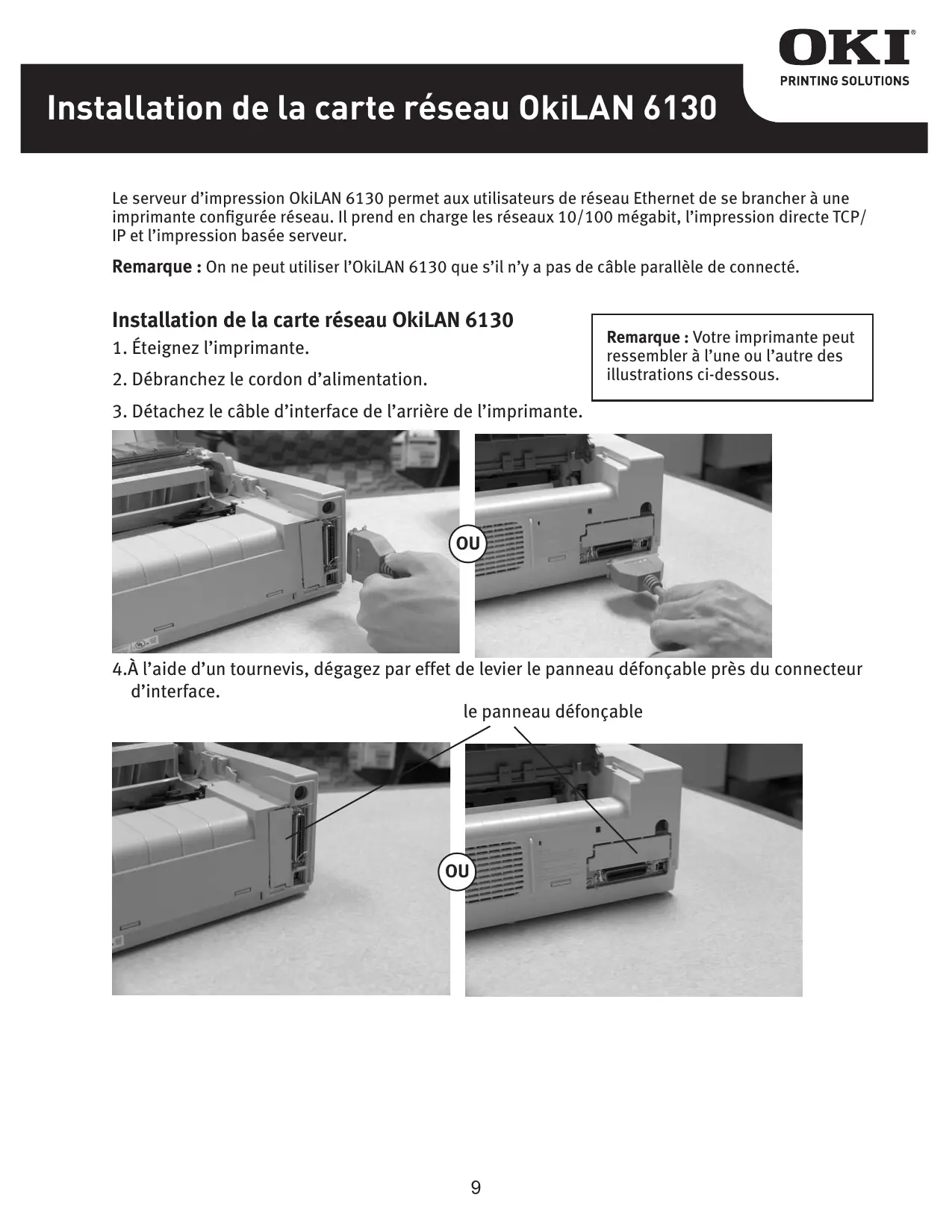 Remarque : On ne peut utiliser l'OkiLAN 6130 que s'il n'y a pas de cable parallele de connecté.