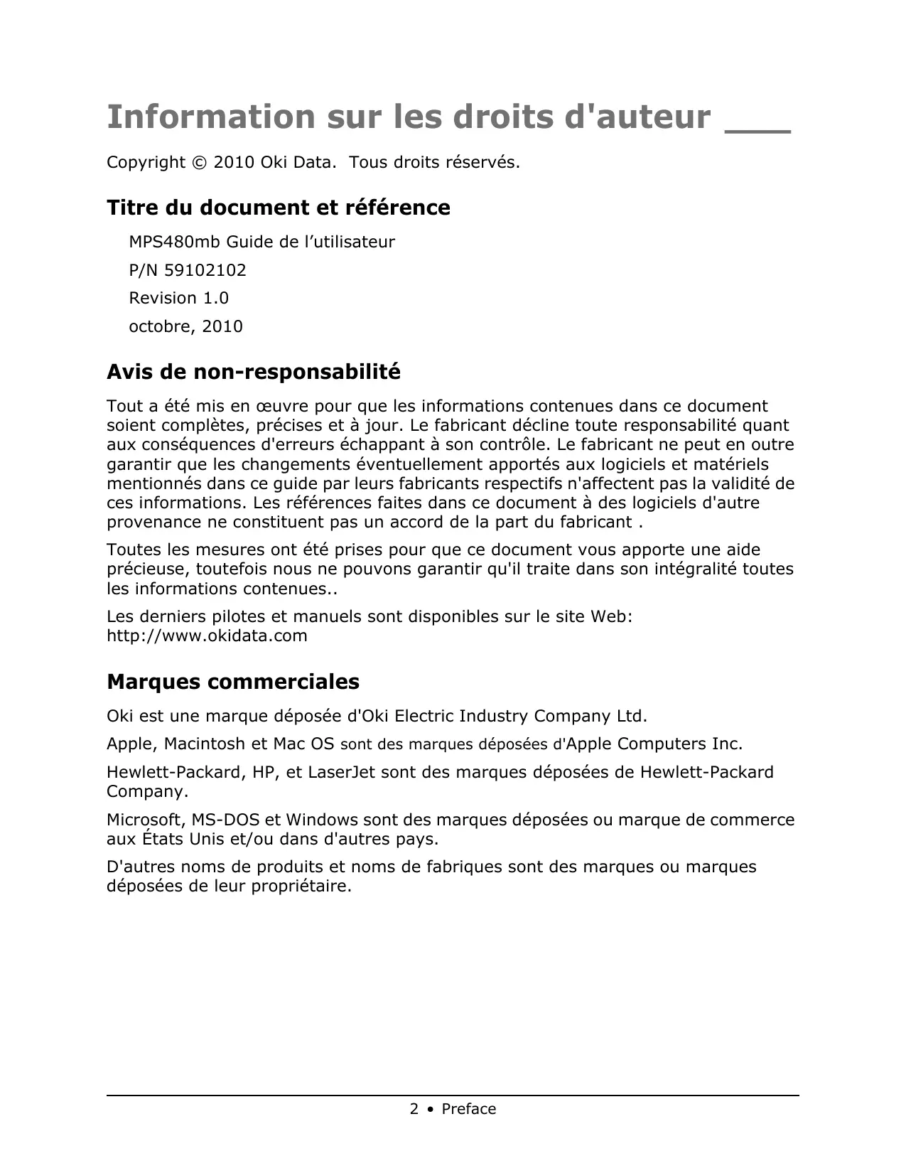 Information sur les droits d'auteur Copyright © 2010 Oki Data. Tous droits réservés. Titre du document et référence MPS480mb Guide de l'utilisateur P/N 59102102 Revision 1.0 octobre, 2010 Avis de non-responsabilité Tout a été mis en œuvre pour que les informations contenues dans ce document soient complètes, précises et à jour. Le fabricant décline toute responsabilité quant aux conséquences d'erreurs échappant à son contrôle. Le fabricant ne peut en outre garantir que les changements éventuellement apportés aux logiciels et matériels mentionnés dans ce guide par leurs fabricants respectifs n'affectent pas la validité de ces informations. Les références faites dans ce document à des logiciels d'autre provenance ne constituent pas un accord de la part du fabricant . Toutes les mesures ont été prises pour que ce document vous apporte une aide précieuse, toutefois nous ne pouvons garantir qu'il traite dans son intégralité toutes les informations contenues. Les derniers pilotes et manuels sont disponibles sur le site Web: http://www.okidata.com Marques commerciales Oki est une marque déposée d'Oki Electric Industry Company Ltd. Apple, Macintosh et Mac OS sont des marques déposées d'Apple Computers Inc. Hewlett-Packard, HP, et LaserJet sont des marques déposées de Hewlett-Packard Company. Microsoft, MS-DOS et Windows sont des marques déposées ou marque de commerce aux États Unis et/ou dans d'autres pays. D'autres noms de produits et noms de fabriques sont des marques où marques déposées de leur propriétaire. 2 * Preface