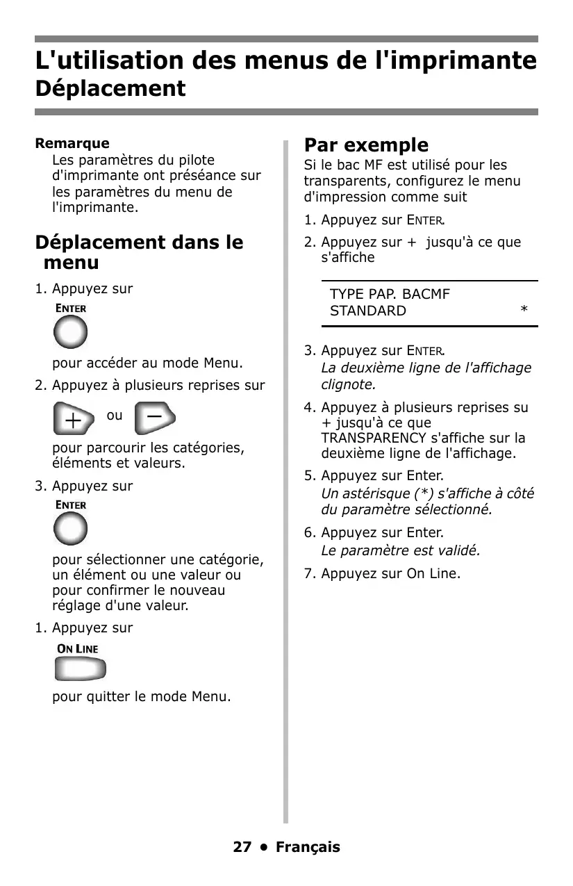 Lorsque l'imprimante est en mode Menu, appuyez sur ENTER pour selectionner un catégorie ou un I'elément.