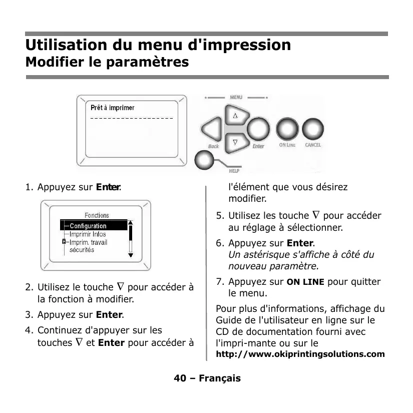 Pour plus d'informations, affichage du Guide de l'utilisateur en ligne sur le CD de documentation fourni avec l'imprimante ou sur le http://www.okiprintingsolutions.com