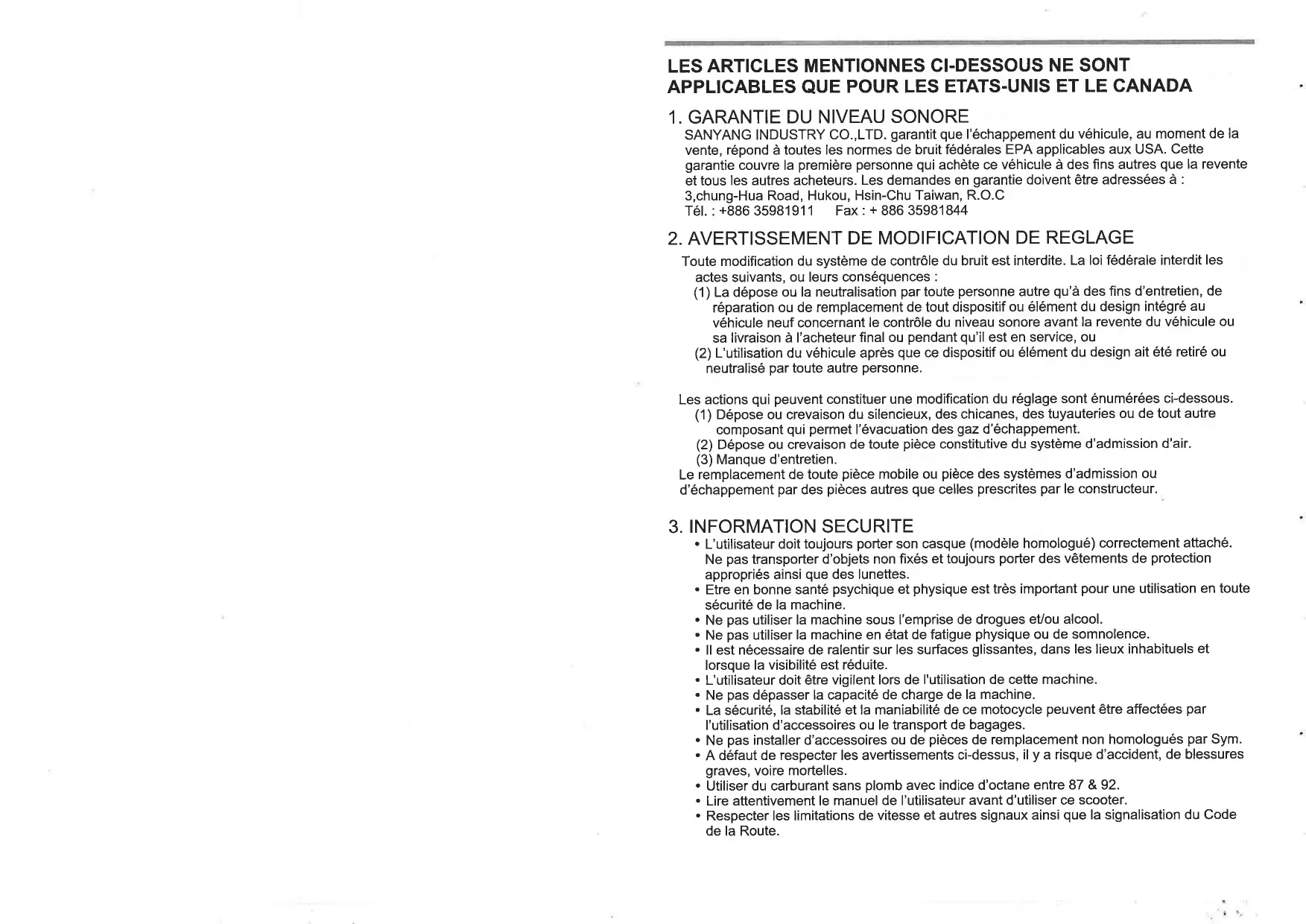 SANYANG INDUSTRY CO.,LTD. garantit que l'échappement du véhicule, au moment de la vente, répond à toutes les normes de bruit fédérales EPA applicables aux USA. Cette garantie couvre la première personne qui achète ce véhicule à des fins autres que la revente et tous les autres acheteurs. Les demandes en garantie doivent être adressées à : 3,chung-Hua Road, Hukou, Hsin-Chu Taiwan, R.O.C Fax : + 886 35981844 Té1. : +886 3598191 'l