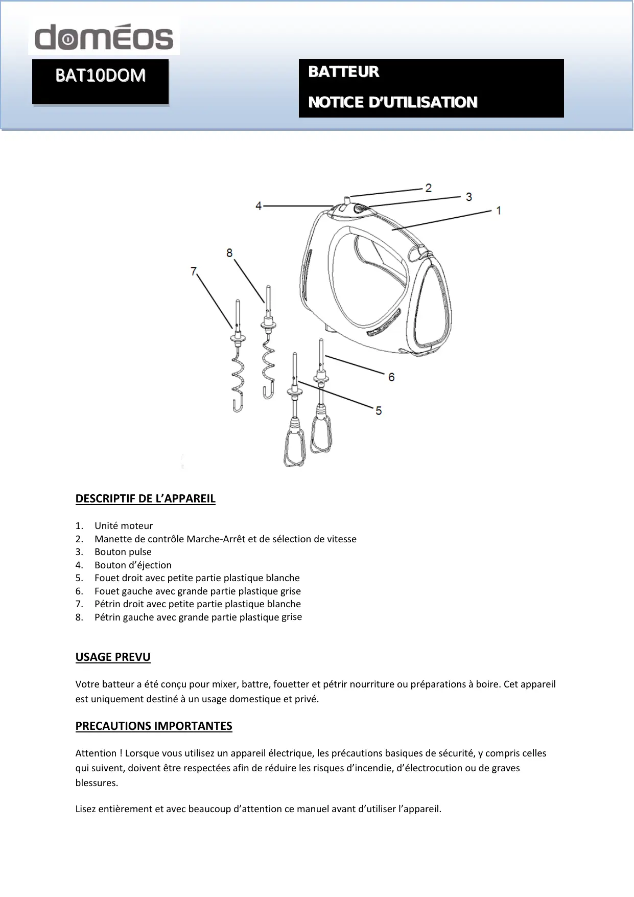 BAT10DOM - Batteur électrique DOMEOS - Notice d'utilisation et mode d'emploi gratuit