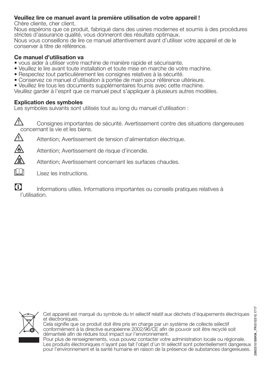 Cet appareil est marqué du symbole du tri sélectif relatif aux déchets d’équipements électriques et électroniques. Cela signifie que ce produit doit être pris en charge par un système de collecte sélectif conformément à la directive européenne 2002/96/CE afin de pouvoir soit être recyclé soit démantelé afin de réduire tout impact sur l’environnement. Pour plus de renseignements, vous pouvez contacter votre administration locale ou régionale. Les produits électroniques n’ayant pas fait l’objet d’un tri sélectif sont potentiellement dangereux pour l’environnement et la santé humaine en raison de la présence de substances dangereuses. 2960310188KM_FR/010310.1717 Informations utiles. Informations importantes ou conseils pratiques relatives à l’utilisation. 1 Consignes importantes de sécurité Cette section comprend des informations relatives à la sécurité qui vous aideront à vous protéger contre les risques de blessures corporelles ou de dégâts matériels. Le non respect de ces instructions entraînera l’annulation de la garantie et de toute responsabilité. Sécurité générale