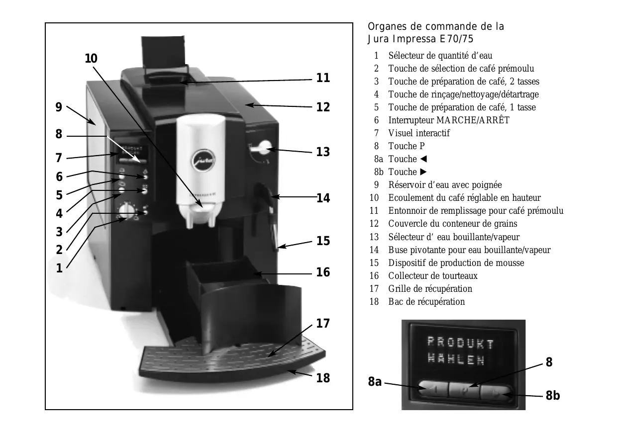 Sélecteur de quantité d’eau Touche de sélection de café prémoulu Touche de préparation de café, 2 tasses Touche de rinçage/nettoyage/détartrage Touche de préparation de café, 1 tasse Interrupteur MARCHE/ARRÊT Visuel interactif Touche P Touche Touche Réservoir d’eau avec poignée Ecoulement du café réglable en hauteur Entonnoir de remplissage pour café prémoulu Couvercle du conteneur de grains Sélecteur d’ eau bouillante/vapeur Buse pivotante pour eau bouillante/vapeur Dispositif de production de mousse Collecteur de tourteaux Grille de récupération Bac de récupération