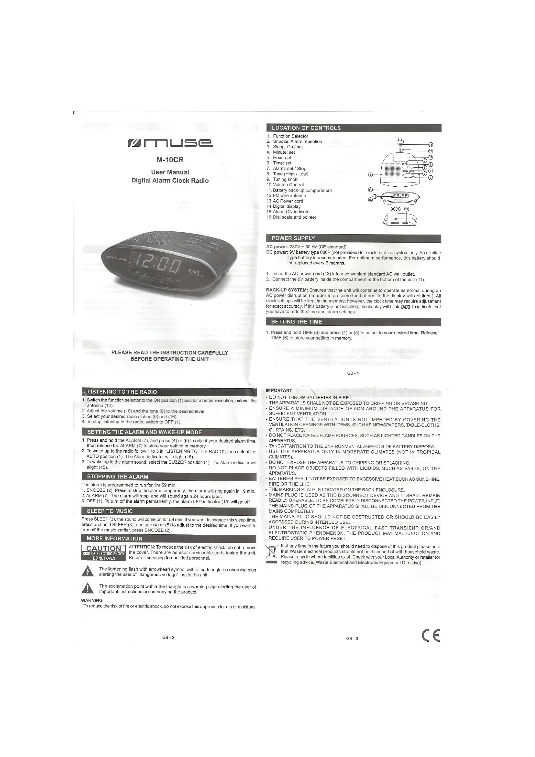 M-10CR - Radio réveil numérique MUSE - Notice d'utilisation et mode d'emploi gratuit