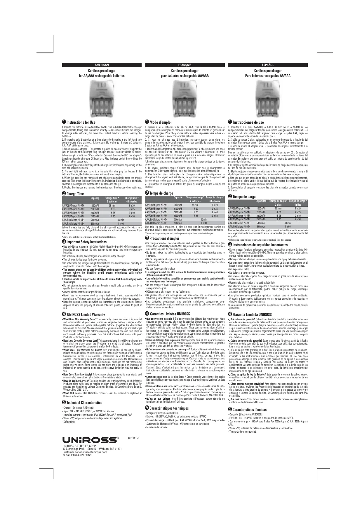 Uniross Nickel Metal Hydride (bajo la denominación los «Productos») utilizados según nuestras instrucciones. Le recomendamos utilizar (descarga y recarga) sus baterías recargables Uniross regularmente, entre una vez y cuatro veces por mes según su compra. Ver las instrucciones que acompañan sus Productos para más detalles.. • ¿Cuánto tiempo dura la garantía? Esta garantía dura (3) años a partir de la fecha de compra con la condición de que los Productos sean utilizados correctamente. La garantía se acaba si vende o cede los Productos. • ¿Qué es lo que esta garantía no cubre? Todo problema resultante de un abuso, de un mal uso o de una modificación, o por la utilización de los Productos en el irrespeto a las instrucciones suministradas por Uniross. El uso con fines profesionales tampoco está cubierto. Esta garantía no se aplica a los usuarios fuera de los Estados Unidos y Canadá. Así como los daños indirectos y accidentales. Algunos estados no autorizan la exclusión o la limitación de los daños indirectos o accidentales, en este caso, la limitación anteriormente mencionada no se aplica a usted. • ¿Cómo se aplica la ley de Estados? Esta garantía le otorga derechos legales específicos y usted puede obtener también otros derechos que varían de un estado a otro. • ¿Cómo obtener nuestros servicios? Para obtener nuestros servicios con arreglo a esta garantía, envíenos los Productos defectuosos acompañados de la copia de la factura u otra prueba de compra y 5 dólares para gastos de envío y de embalaje a Uniross Customer Service, 52 Cummings Park, Suite D, Woburn, MA 01801 USA. • ¿Qué hará Uniross? Los Productos defectuosos serán reparados o reemplazados conforme a la decisión de Uniross..