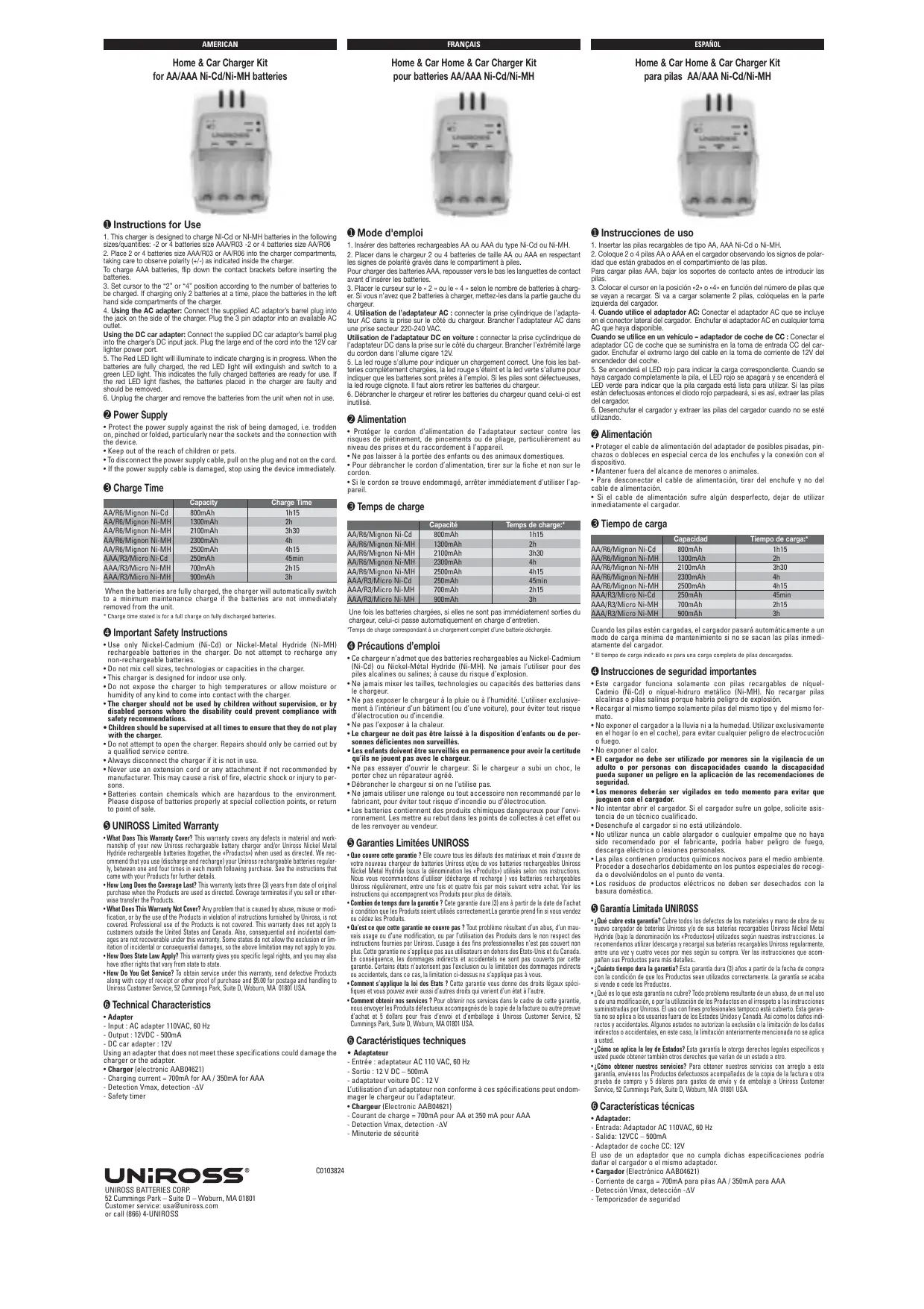 • Que couvre cette garantie ? Elle couvre tous les défauts des matériaux et main d’œuvre de votre nouveau chargeur de batteries Uniross et/ou de vos batteries rechargeables Uniross Nickel Metal Hydride (sous la dénomination les «Produits») utilisés selon nos instructions. Nous vous recommandons d’utiliser (décharge et recharge ) vos batteries rechargeables Uniross régulièrement, entre une fois et quatre fois par mois suivant votre achat. Voir les instructions qui accompagnent vos Produits pour plus de détails. • Combien de temps dure la garantie ? Cete garantie dure (3) ans à partir de la date de l’achat à condition que les Produits soient utilisés correctement.La garantie prend fin si vous vendez ou cédez les Produits. • Qu’est ce que cette garantie ne couvre pas ? Tout problème résultant d’un abus, d’un mauvais usage ou d’une modification, ou par l’utilisation des Produits dans le non respect des instructions fournies par Uniross. L’usage à des fins professionnelles n’est pas couvert non plus. Cette garantie ne s’applique pas aux utilisateurs en dehors des Etats-Unis et du Canada. En conséquence, les dommages indirects et accidentels ne sont pas couverts par cette garantie. Certains états n’autorisent pas l’exclusion ou la limitation des dommages indirects ou accidentels, dans ce cas, la limitation ci-dessus ne s’applique pas à vous. • Comment s’applique la loi des Etats ? Cette garantie vous donne des droits légaux spécifiques et vous pouvez avoir aussi d’autres droits qui varient d’un état à l’autre. • Comment obtenir nos services ? Pour obtenir nos services dans le cadre de cette garantie, nous envoyer les Produits défectueux accompagnés de la copie de la facture ou autre preuve d’achat et 5 dollars pour frais d’envoi et d’emballage à Uniross Customer Service, 52 Cummings Park, Suite D, Woburn, MA 01801 USA.