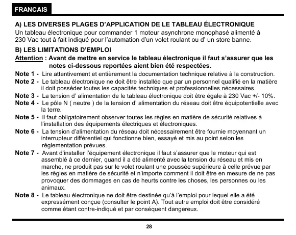Attention : Avant de mettre en service le tableau électronique il faut s’assurer que les notes ci-dessous reportées aient bien été respectées. Note 1 - Lire attentivement et entièrement la documentation technique relative à la construction. Note 2 - Le tableau électronique ne doit être installée que par un personnel qualifié en la matière il doit posséder toutes les capacités techniques et professionnelles nécessaires. Note 3 - La tension d’ alimentation de le tableau électronique doit être égale à 230 Vac +/- 10%. Note 4 - Le pôle N ( neutre ) de la tension d’ alimentation du réseau doit être équipotentielle avec la terre. Note 5 - Il faut obligatoirement observer toutes les règles en matière de sécurité relatives à l’installation des équipements électriques et électroniques. Note 6 - La tension d’alimentation du réseau doit nécessairement être fournie moyennant un interrupteur différentiel qui fonctionne bien, essayé et mis au point selon les réglementation prévues. Note 7 - Avant d’installer l’équipement électronique il faut s’assurer que le moteur qui est assemblé à ce dernier, quand il a été alimenté avec la tension du réseau et mis en marche, ne produit pas sur le volet roulant une poussée supérieure à celle prévue par les règles en matière de sécurité et n’importe comment il doit être en mesure de ne pas provoquer des dommages en cas de heurts contre les choses, les personnes ou les animaux. Note 8 - Le tableau électronique ne doit être destinée qu’à l’emploi pour lequel elle a été expressément conçue (consulter le point A). Tout autre emploi doit être considéré comme étant contre-indiqué et par conséquent dangereux.