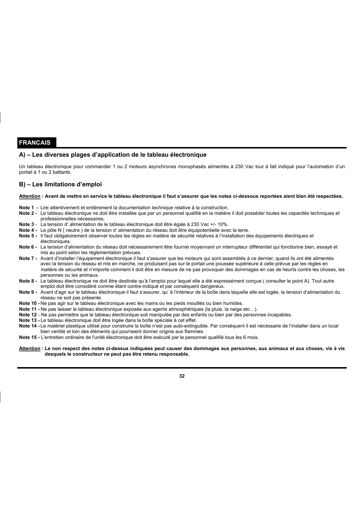 FRANCAIS A) – Les diverses plages d’application de le tableau électronique Un tableau électronique pour commander 1 ou 2 moteurs asynchrones monophasés alimentés à 230 Vac tout à fait indiqué pour l’automation d’un portail à 1 ou 2 battants. B) – Les limitations d’emploi Attention : Avant de mettre en service le tableau électronique il faut s’assurer que les notes ci-dessous reportées aient bien été respectées. Note 1 - Lire attentivement et entièrement la documentation technique relative à la construction. Note 2 - Le tableau électronique ne doit être installée que par un personnel qualifié en la matière il doit posséder toutes les capacités techniques et professionnelles nécessaires. Note 3 - La tension d’ alimentation de le tableau électronique doit être égale à 230 Vac +/- 10%. Note 4 - Le pôle N ( neutre ) de la tension d’ alimentation du réseau doit être équipotentielle avec la terre. Note 5 - Il faut obligatoirement observer toutes les règles en matière de sécurité relatives à l’installation des équipements électriques et électroniques. Note 6 - La tension d’alimentation du réseau doit nécessairement être fournie moyennant un interrupteur différentiel qui fonctionne bien, essayé et mis au point selon les réglementation prévues. Note 7 - Avant d’installer l’équipement électronique il faut s’assurer que les moteurs qui sont assemblés à ce dernier, quand ils ont été alimentés avec la tension du réseau et mis en marche, ne produisent pas sur le portail une poussée supérieure à celle prévue par les règles en matière de sécurité et n’importe comment il doit être en mesure de ne pas provoquer des dommages en cas de heurts contre les choses, les personnes ou les animaux. Note 8 - Le tableau électronique ne doit être destinée qu’à l’emploi pour lequel elle a été expressément conçue ( consulter le point A). Tout autre emploi doit être considéré comme étant contre-indiqué et par conséquent dangereux. Note 9 - Avant d’agir sur le tableau électronique il faut s’assurer, qu’ à l’intérieur de la boîte dans laquelle elle est logée, la tension d’alimentation du réseau ne soit pas présente. Note 10 - Ne pas agir sur le tableau électronique avec les mains ou les pieds mouillés ou bien humides. Note 11 - Ne pas laisser le tableau électronique exposée aux agents atmosphériques (la pluie, la neige etc…). Note 12 - Ne pas permettre que le tableau électronique soit manipulée par des enfants ou bien par des personnes incapables. Note 13 - Le tableau électronique doit être logée dans la boîte spéciale à cet effet. Note 14 - Le matériel plastique utilisé pour construire la boîte n’est pas auto-extinguible. Par conséquent il est nécessaire de l’installer dans un local bien ventilé et loin des éléments qui pourraient donner origine aux flammes. Note 15 - L'entretien ordinaire de l'unité électronique doit être exécuté par le personnel qualifié tous les 6 mois. Attention : Le non respect des notes ci-dessus indiquées peut causer des dommages aux personnes, aux animaux et aux choses, vis à vis desquels le constructeur ne peut pas être retenu responsable.