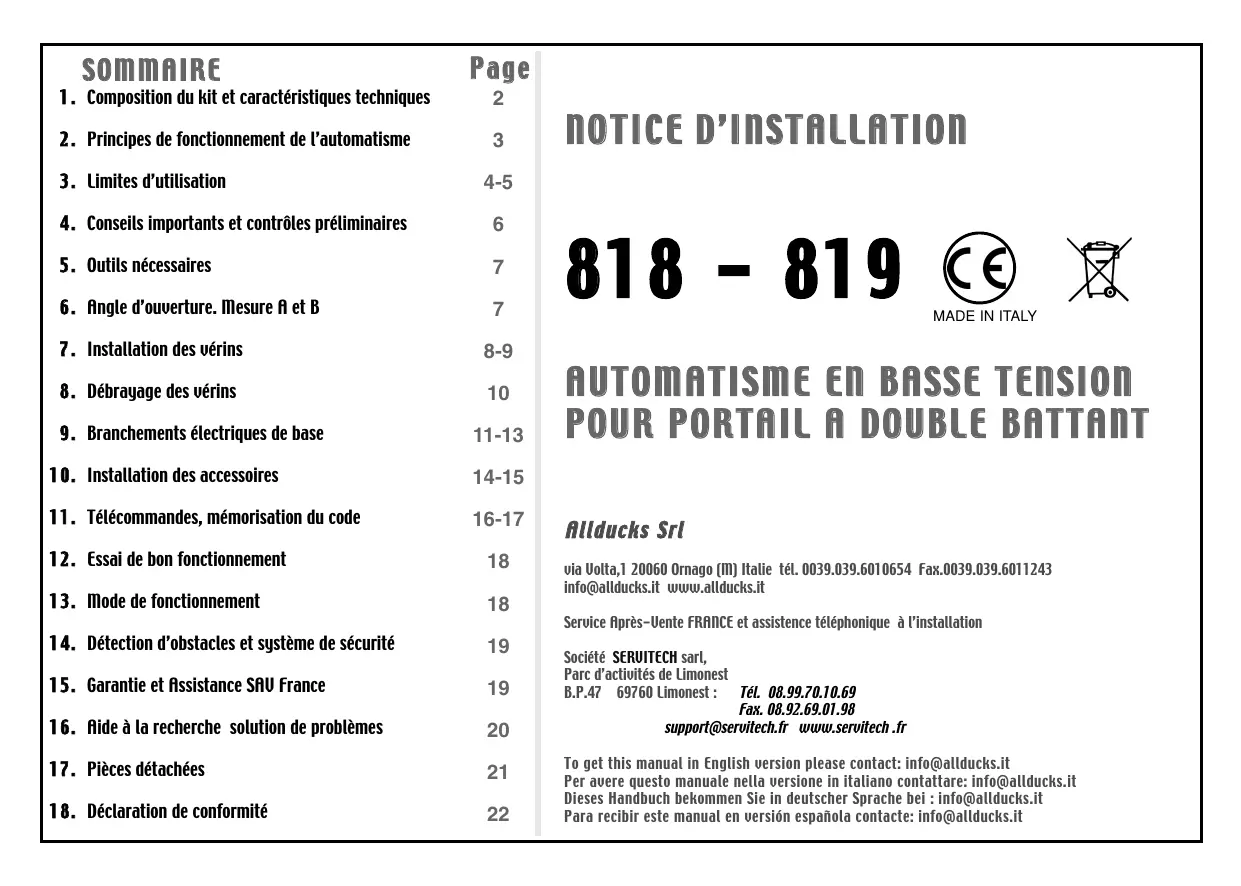 1 1 . Télécommandes, mémorisation du code 16-17 Allducks Srl 9 . Branchements électriques de base 11-13 1 2 . Essai de bon fonctionnement