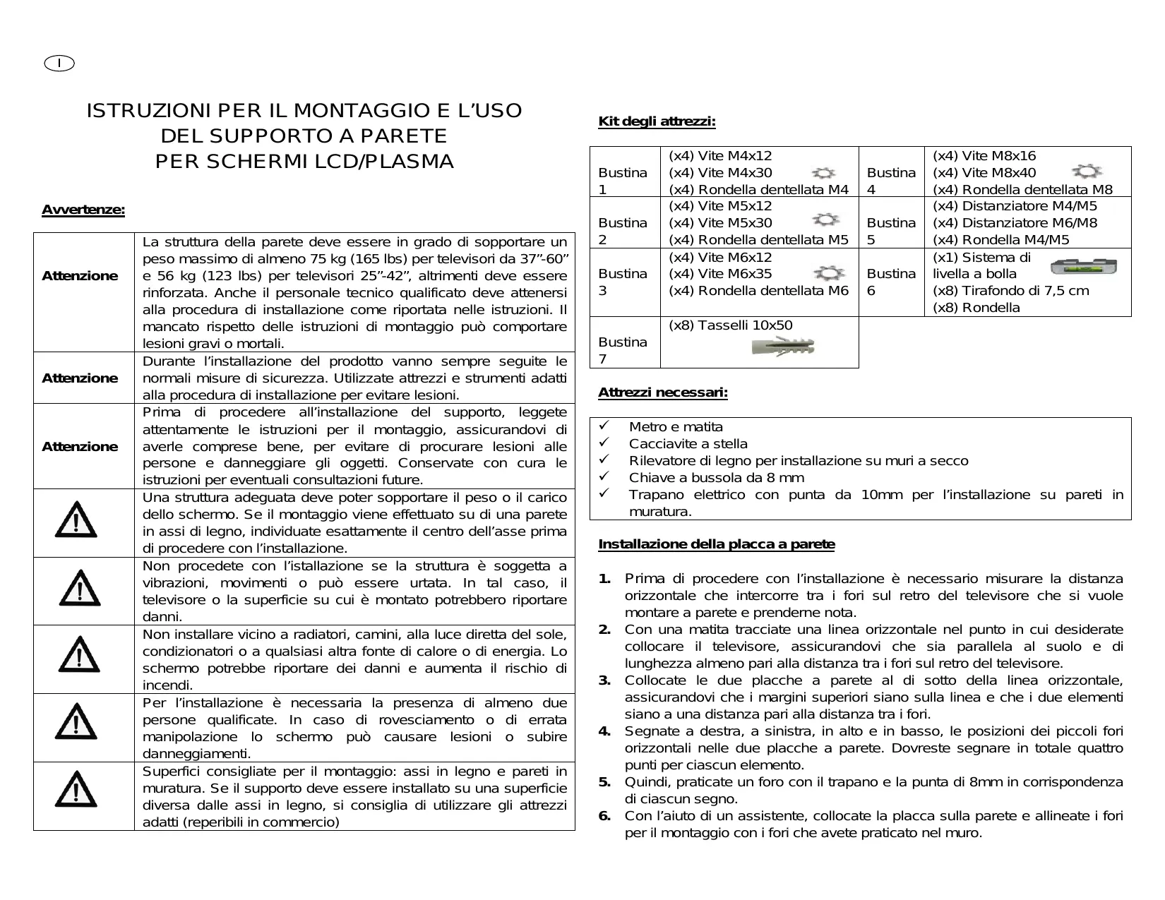 | Attention | Avant de commencer l'installation du support, dire attentivement les instructions de montage en s'assurant de bien les avoir comprises afin d'éviter toute blessure de personnes et tout endommagement des objets. Conserver scrupuleusement cette notice pour toute éventuelle consultation future. |