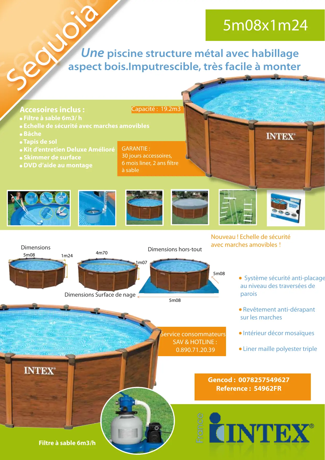 SSe 5m08x1m24 Une piscine structure métal avec habillage aspect bois.Imputrescible, très facile à monter Accesoires inclus : Capacité : 19.2m3 Filtre à sable 6m3/ h Echelle de sécurité avec marches amovibles Bâche Tapis de sol Kit d’entretien Deluxe Amélioré GARANTIE : 30 jours accessoires, Skimmer de surface 6 mois liner, 2 ans filtre DVD d’aide au montage à sable Dimensions 5m08 1m24 Dimensions hors-tout 4m70 Nouveau ! Echelle de sécurité avec marches amovibles ! 1m07 5m08 Dimensions Surface de nage 5m08 Système sécurité anti-placage au niveau des traversées de parois Revêtement anti-dérapant sur les marches Service consommateurs : SAV & HOTLINE :