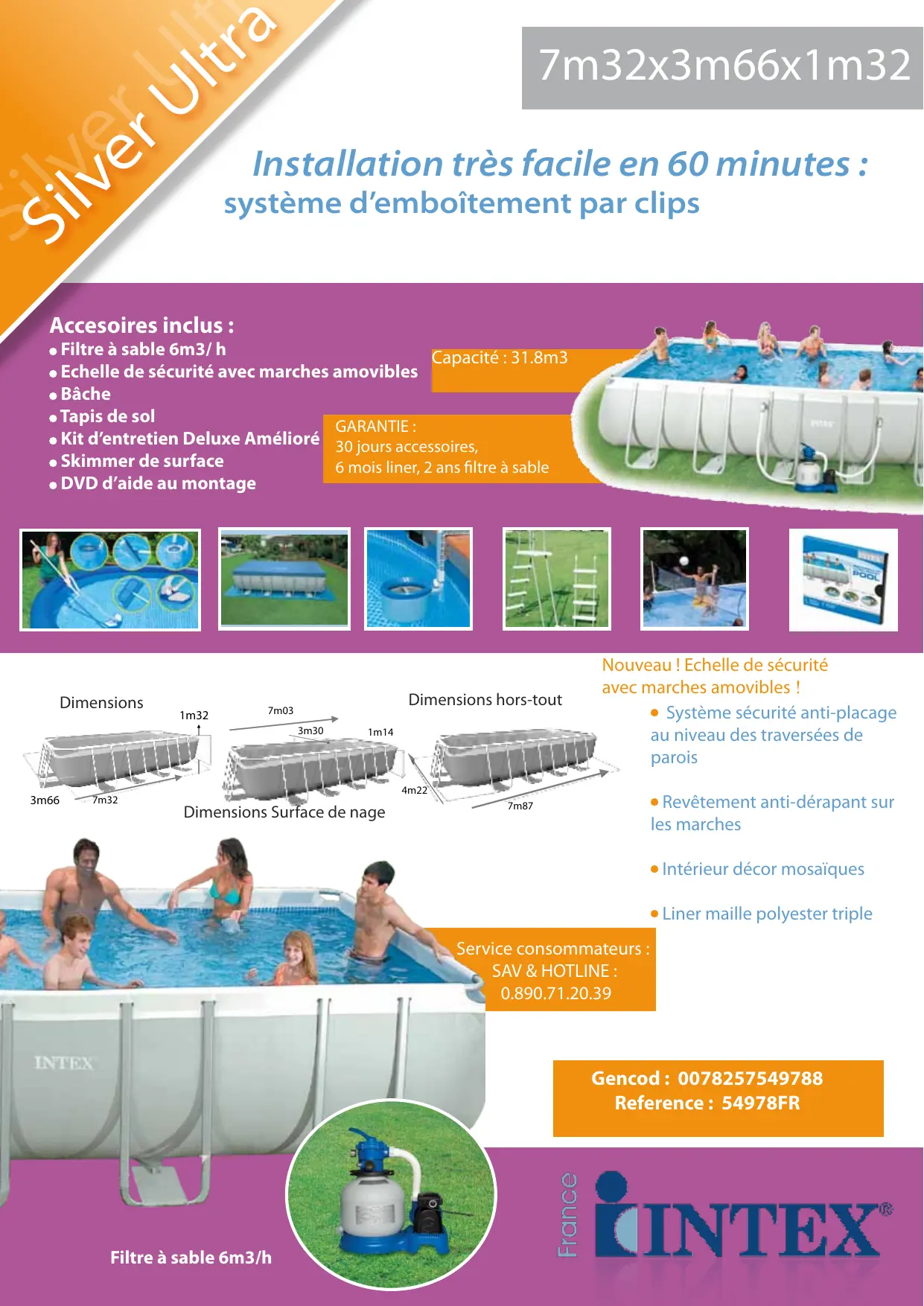 7m32x3m66x1m32 Installation très facile en 60 minutes : système d’emboîtement par clips Accesoires inclus : Filtre à sable 6m3/ h Capacité : 31.8m3 Echelle de sécurité avec marches amovibles Bâche Tapis de sol GARANTIE : Kit d’entretien Deluxe Amélioré 30 jours accessoires, Skimmer de surface 6 mois liner, 2 ans filtre à sable DVD d’aide au montage Dimensions 1m32 Dimensions hors-tout 7m03 3m30 3m66 7m32 1m14 Nouveau ! Echelle de sécurité avec marches amovibles ! Système sécurité anti-placage au niveau des traversées de parois 4m22 Dimensions Surface de nage Revêtement anti-dérapant sur les marches 7m87 Intérieur décor mosaïques Liner maille polyester triple Service consommateurs : SAV & HOTLINE :
