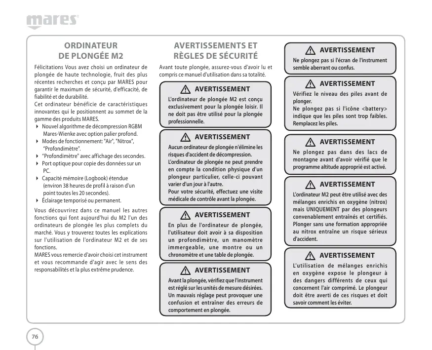 Félicitations Vous avez choisi un ordinateur de plongée de haute technologie, fruit des plus récentes recherches et conçu par MARES pour garantir le maximum de sécurité, d'efficacité, de fiabilité et de durabilité. Cet ordinateur bénéficie de caractéristiques innovantes qui le positionnent au sommet de la gamme des produits MARES. Nouvel algorithme de décompression RGBM Mares-Wienke avec option palier profond. Modes de fonctionnement: "Air", "Nitrox", “Profondimètre". “Profondimètre" avec affichage des secondes. Port optique pour copie des données sur un PC. Capacité mémoire (Logbook) étendue (environ 38 heures de profil à raison d'un point toutes les 20 secondes). Éclairage temporisé ou permanent. Avant toute plongée, assurez-vous d'avoir lu et compris ce manuel d'utilisation dans sa totalité. Vous découvrirez dans ce manuel les autres fonctions qui font aujourd'hui du M2 l'un des ordinateurs de plongée les plus complets du marché. Vous y trouverez toutes les explications sur l'utilisation de l'ordinateur M2 et de ses fonctions. MARES vous remercie d'avoir choisi cet instrument et vous recommande d'agir avec le sens des responsabilités et la plus extrême prudence.