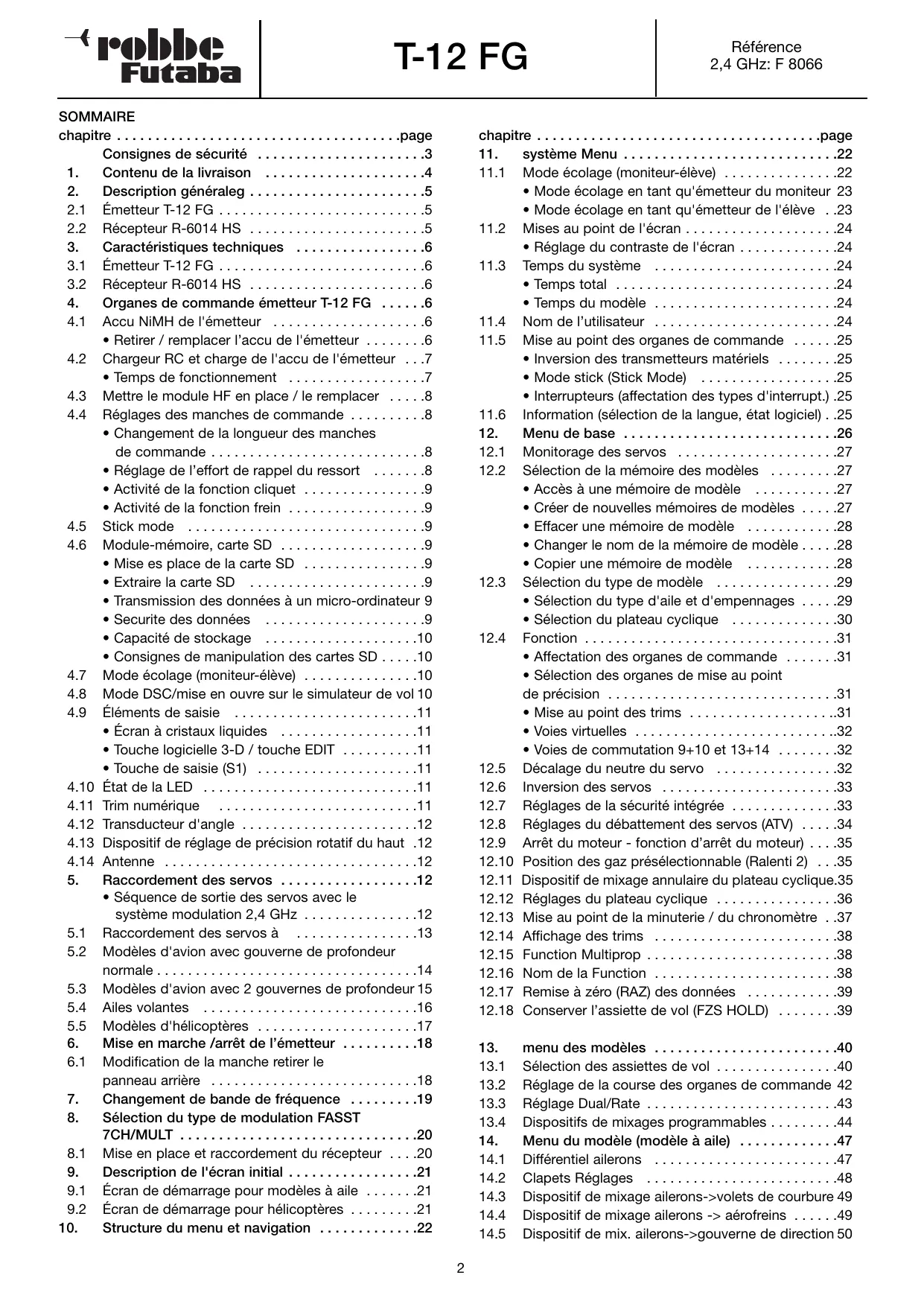 Futaba 1-12 FG Référence 2,4 GHz: F 8066 SOMMAIRE chapitre .