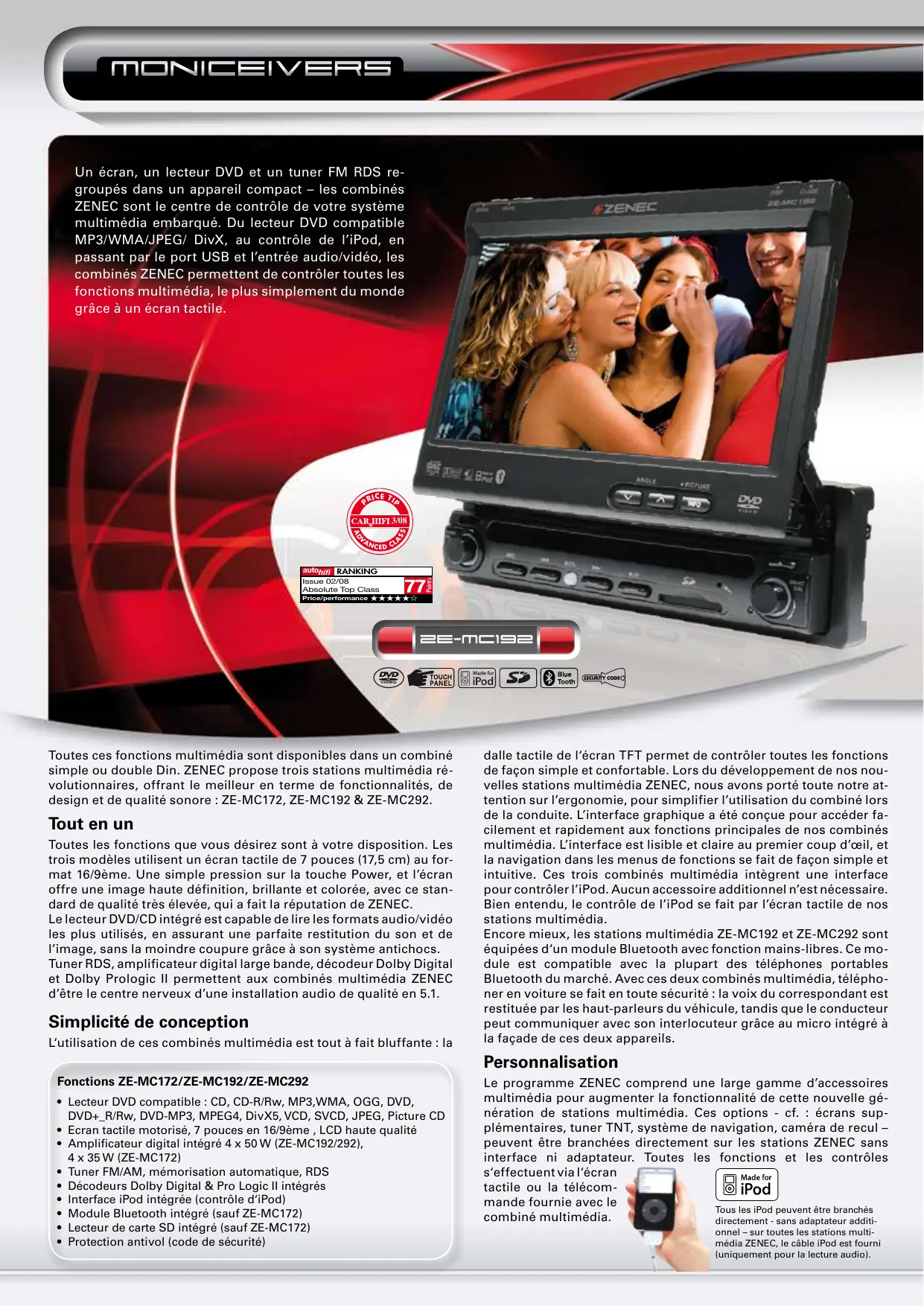 Toutes ces fonctions multimédia sont disponibles dans un combiné simple ou double Din. ZENEC propose trois stations multimédia révolutionnaires, offrant le meilleur en termes de fonctionnalités, de design et de qualité sonore : ZE-MC172, ZE-MC192 et ZE-MC292.