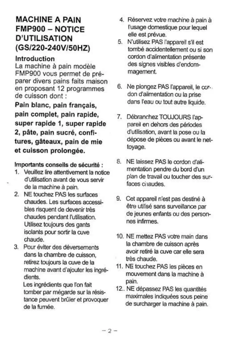 FMP900 - Machine à pain FUNIX - Notice d'utilisation et mode d'emploi gratuit