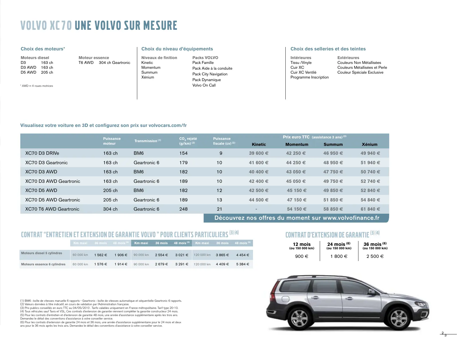 Choix des moteurs* Choix du niveau d'équipements Choix des selleries et des teintes Moteurs diesel Moteur essence Niveaux de finition Packs VOLVO Intérieures Extérieures D3 168 ch T6 AWD 804 ch Geartronic | Kinetic Pack Famille Tissu {Vinyle Couleurs Non Métalisées D3 AWD 168 ch Momentum Pack Aide à la conduite Cuir XC Couleurs Métalisées et Perle D5 AWD _ 205 ch Summum Pack City Navigation Cuir XC Ventilé Couleur Spéciale Exclusive Xénium Programme Inscription Pack Dynamique *'AWD = à roues morices Volvo On Call Visualisez votre voiture en 3D et configurez son prix sur volvocars.com/fr = NN CO, rejeté ns Prix euro TTC (assistance 3 ans) ©” moteur (g/km) ® fiscale (cv) ® XC70 D3 DRIVe 163 ch BM6 154 9° 39 600€ 42250 € 46950 € 49 940€ XC70 D3 Geartronic 163 ch Geartronie 6 179 10 41 600 € 44 250 € 48950 € 51 940€ XC70 D3 AWD 163 ch BM6 182 10 40400 € 43 050 € 47750 € 50 740€ XC70 D3 AWD Geartronic 163 ch Geartronic 6 189 10 42400€ 45 050 € 49750 € 52740€ XC70 D5 AWD 205 ch BM6 182 12 42500 € 45150 € 49 850€ 52 840€ XC70 D5 AWD Geartronic 205 ch Geartronic 6 189 13 44 500 € 47150€ 51 850€ 54 840€ XC70 T6 AWD Geartronic: 304 ch Geartronie 6 248 21 - 54 150€ 58 850 € 61 840€ Découvrez nos offres du moment sur www.volvofinance. CONTRAT “ENTRETIEN ET EXTENSION DE GARANTIE VOLVO ” POUR CLIENTS PARTICULIERS (114 CONTRAT D'EXTENSION DE GARANTIE 3/14) Lim mas _s6mois 45 mois BKman semis tn) 12 mois 24 mois (© 36 mois () (ou 150 000 km) (ou 150 000 km) | (ou 160 000 km) Moteurs diesel S cylindres Go gooim 1662€ 1906€ S0000km 2584€ 3021€ 120000km 3865€ 4454€ 900 € 1 800€ 2 500 € Moteurs essence 6 cylindres 60000km 1576€ 1914€ g0000km 2679€ 8291€ 120000km 4409€ 5384€ (1) BMS aïe de vitesses manuel 6 rapports - Geartron: boite de vtesses automatique at séquentiale Gearronie 6 rapports. (2) Valeurs données à tre indicatif en cours de vallon par lAdmiisation française, {@) Prx publie conseilés en eura TTC au 04/08/2010. Tarifs valables uniquement en France métropoltaine. Tanf ype 20-10. ) Tous véhicules sauf Tanls et VSL Ces contrats d'extension de garantie viennent compléter la garantie constructeur 24 mois. (6) Pour les contrats d'entretien at d'extension de garantie 48 mois, une année d'assistance supplémentaire après les Pos an, Demandes a détal des conventions d'assistance à votre conseil senice, (6) Pour les contrats d'extension de garantie 24 mais et 36 mais une année d'assistance supplémentaire pour le 24 mais et deux ans pour le 46 mois après les os ans, Demande le détail des conventions d'assistance à votre conseller senvice