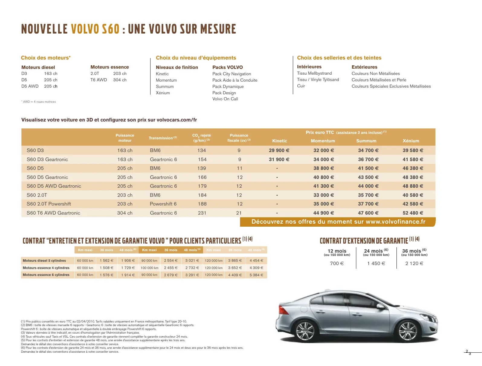 Tarifs au 02/04/2010 valables en France métropolitaine. Ce tarif annule et remplace certains édités précédemment. Il concerne le type 20-10 de la nouvelle VOLVO S60. Modèles présentés dans cette brochure avec options et accessoires.