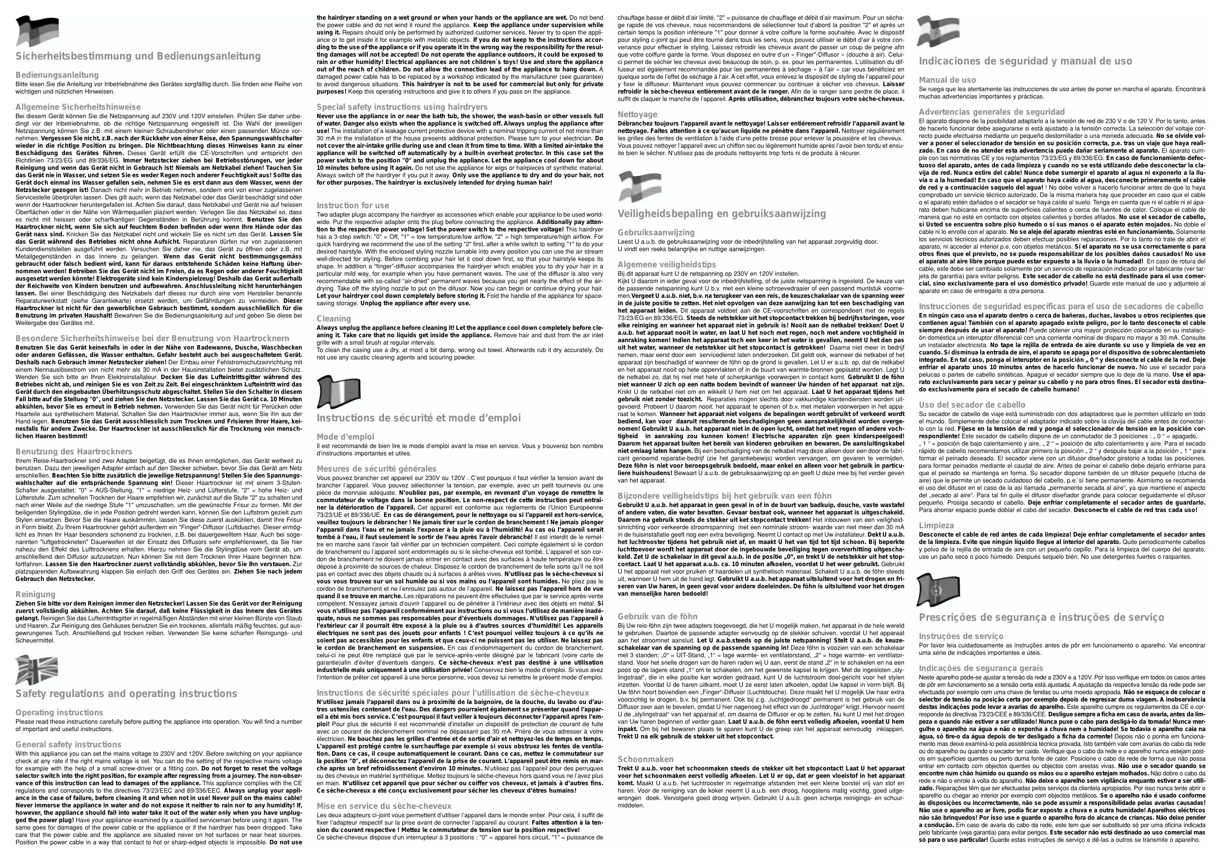 Voupez brancher cet apparéil sur 230V ou 120V. C'est pourquoit il faut vérifier la tension avant de branchier l' apparéil. Vous pouze scélectionner la tension, par exemple, avec un petit tournevis ou une piece de monnaie adéquate. N'oubliez pas, par exemple, en revenant d'un voyage de remêtre le commutateur de voltage dans la bonne position. Le non-respect de cette instruction peut entrainer la déterioration de l' apparéil. Cet apparéil est conforme aux règlements de l'Union Européenne 73/23/UE et 89/336/UE. En cas de dérangement, pour le nettoyage ou si l' apparéil est hors-service, veuillée toutes le débrancher! Ne jamais tirer sur le cordon de branchement! Ne jamais plonger l' apparéil dans l'eau et ne jamais l'exposer à la pluie ou à l'humidité! Au cas où l' apparéil serait tombé à l'eau, il faut seulement le sortir de l'eau après l'avoir débranché! Il est interidet de le remetre en marche sans l'avoir fait vérifier par un technicien competent. Ceci compte également si le cordon de branchement ou l' apparéil sont endommages ou si le sèche-cheveux est tombé. L' apparéil et son cordon de branchement ne doivent entre en contact avec des surfaces à haute température ou être déposé à proximate de sources de chaleur. Dispensez le cordon de branchement de telle sorte qu'il ne soit pas en contact avec des objets chauds ou à surfaces à arêtes vises. N'utilise pas le sèche-cheveux si vous vous trouvez sur un sol humide ou si vos mains ou l' apparéil sont humides. Ne pliez pas le cordon de branchement et ne l'enroulez pasASFaut derl'appareil.Naisssez pas l' apparéil hors de vue quand il se fouve en marche. Les réparations ne peuvent être effectuees que par le service après-vente compétent. N'essayez jamais d'ouvir l' apparéil ou de pénétrer à l'intérieur avec des objets en métal. Si vous n'utilissez pas l' apparéil conformément aux instructions ou si vous l'utilise de manière inadéquate, nous ne sommes pas responsables pour f'd'éventuels dommages. N'utilissez pas l' apparéil a l'extérieur car il pourrait être exposé à la pluie ou a d'autres sources d'humidité! Les apparéils électriques ne sont pas des jouets pour enfants! C'est pourquoi voirlez plusieurs au ce qu'il ne soit pas accessibles pour les enfants et que certains ne puissant pas les utiliser. Ne laissez pas le cordon de branchement en suspension. En cas d'emendagement du cordon de branchement, celui-ci ne peut être remplace que par le service-après-vente désigné par le fabricant (voire carte de garante)afin d'évitier d'éventuels dangers. Ce sèche-cheveux n'est pas destiné a une utilisation industrielle mais uniquement à une utilisation privée! Conserve bien le mode d'emploi. Si vous avrez l'intention de préter cet apparéil à une fierce personne, vous vedez lui remettre le present mode d'emploi.